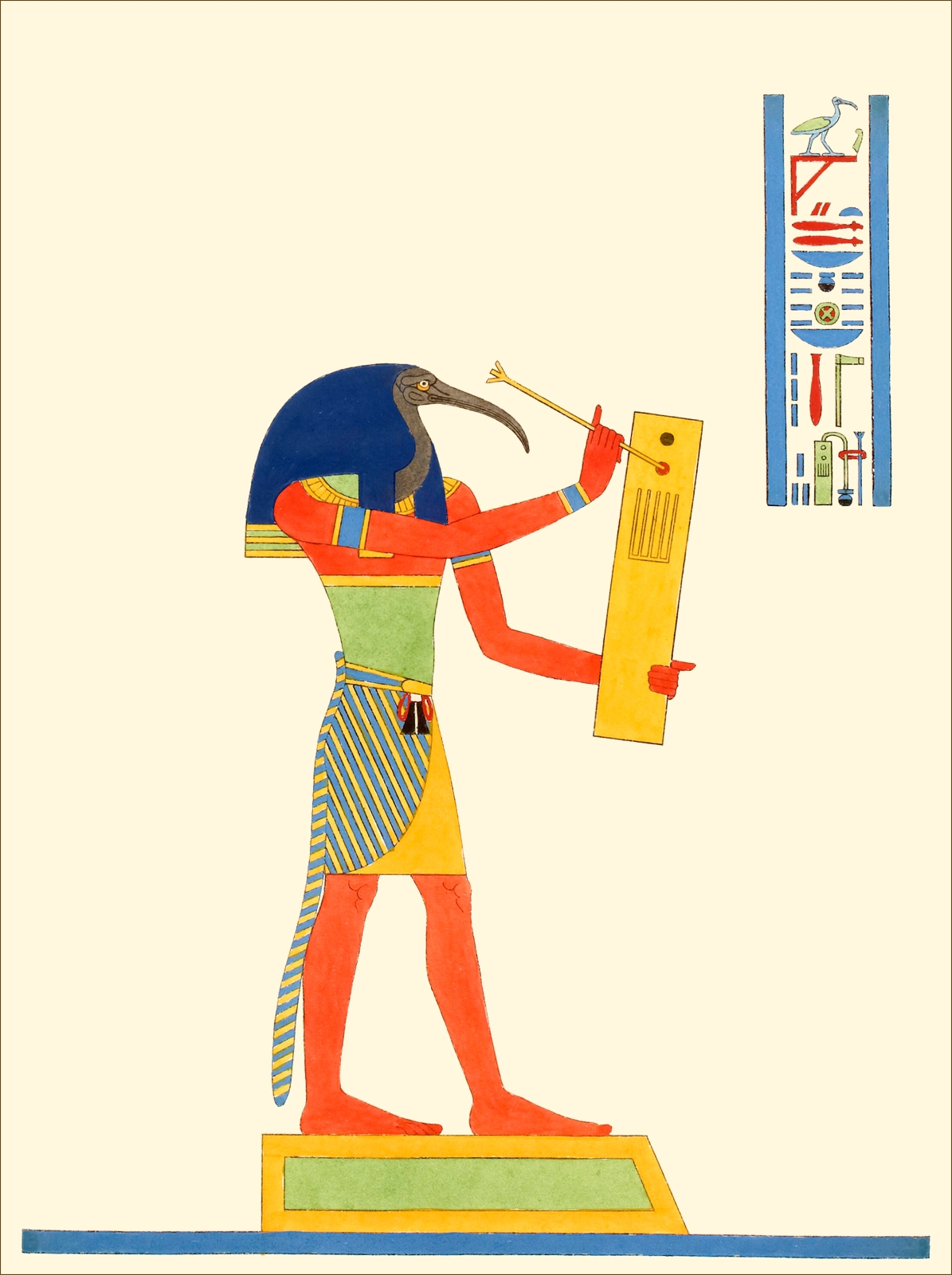 [433] Voyez planches 29, lég. no 1; et 29.2, lég. no 1.—Caylus, tome VI, pl. a, no 2 et 3.—Grand Mss. hiérogl., Description de l’Egypte, pl. 72; Scène du Jugement, lég. du Dieu; et toutes les légendes de Thoth Ibiocéphale sur les cercueils de momies.