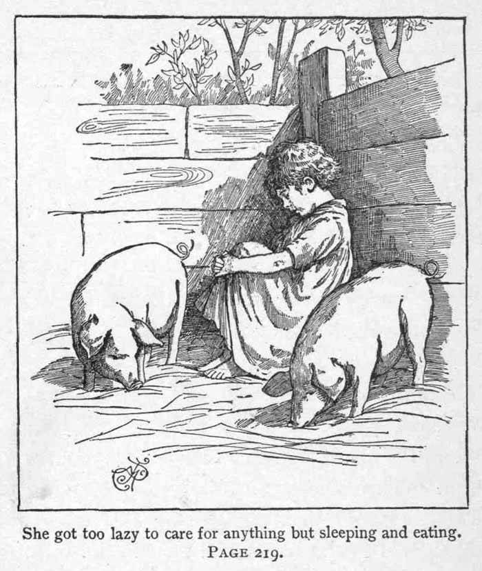 She lay thinking about it and blinking at the moon for a while; then she got up very softly, and crept down the back stairs, through the garden, to the sty where two nice little pigs were fast asleep among the straw in their small house. They only grunted when Betty crept into a corner, laughing at the fun it would be to play piggy and live here with no Maria to wash her and no careful mamma to keep saying,—
