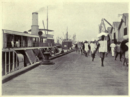 It has most of the characteristics of a port. On the 3,000 feet frontage two ocean liners can lie end-on—there is always one berthed—and seven of the eight hatches simultaneously discharging or loading; smaller craft—branch boats of 1,000 tons to stern-wheelers and launches for river traffic—are continuously bringing produce and passengers and taking up country small goods, among which bags of salt occupy an important place; whilst the coal wharf knows no rest. Awaiting shipment are 7,000 casks of palm-oil. Recently there were 10,000.