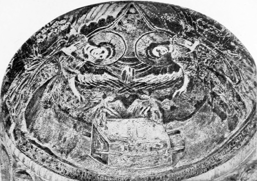 Tympanon: halbrundes tiefer liegendes Feld über einer Tür, von einem Bogen umfaßt.