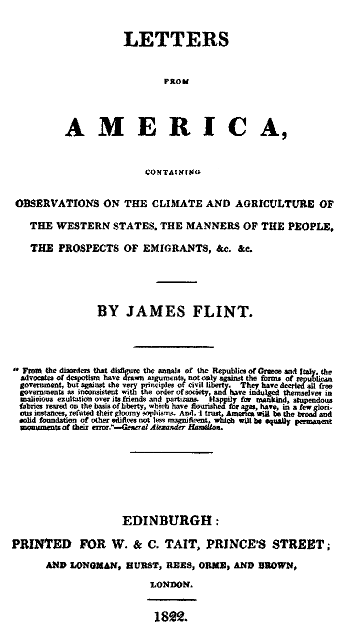 James Flint was of a good family, had been carefully educated, and possessed a sound and just judgment, with capacity for philosophic insight. Coming to the United States to observe conditions, he depicts them with candor and good will. While confessing favorable preconceptions, due to a personal liking for democratic institutions, our author does not omit the shadows in his pictures; but he presents them with such dispassionate fairness that the sting of criticism is removed.