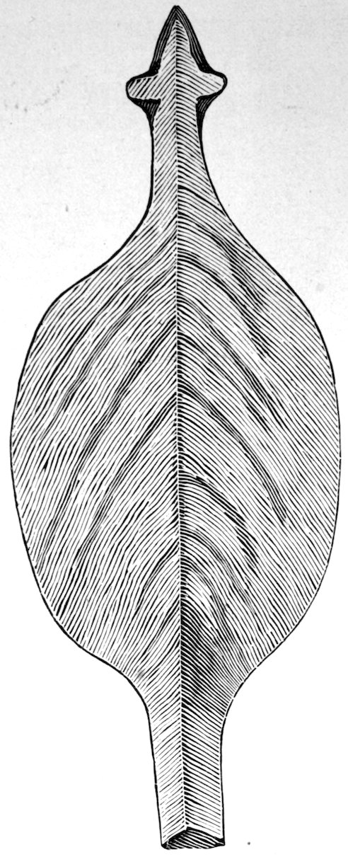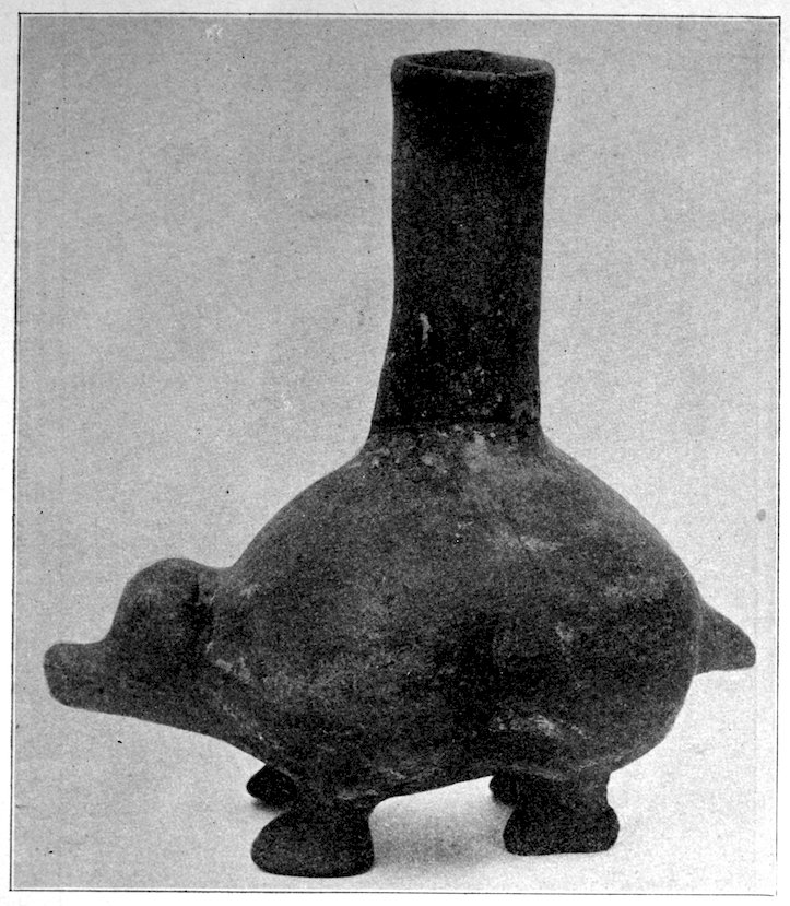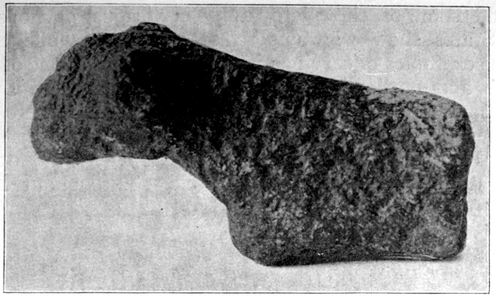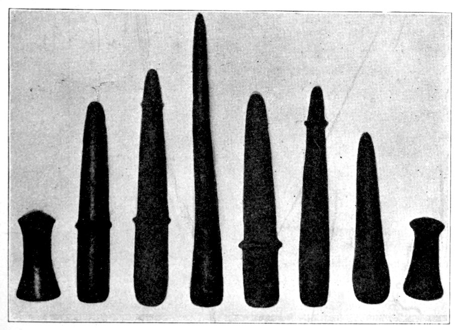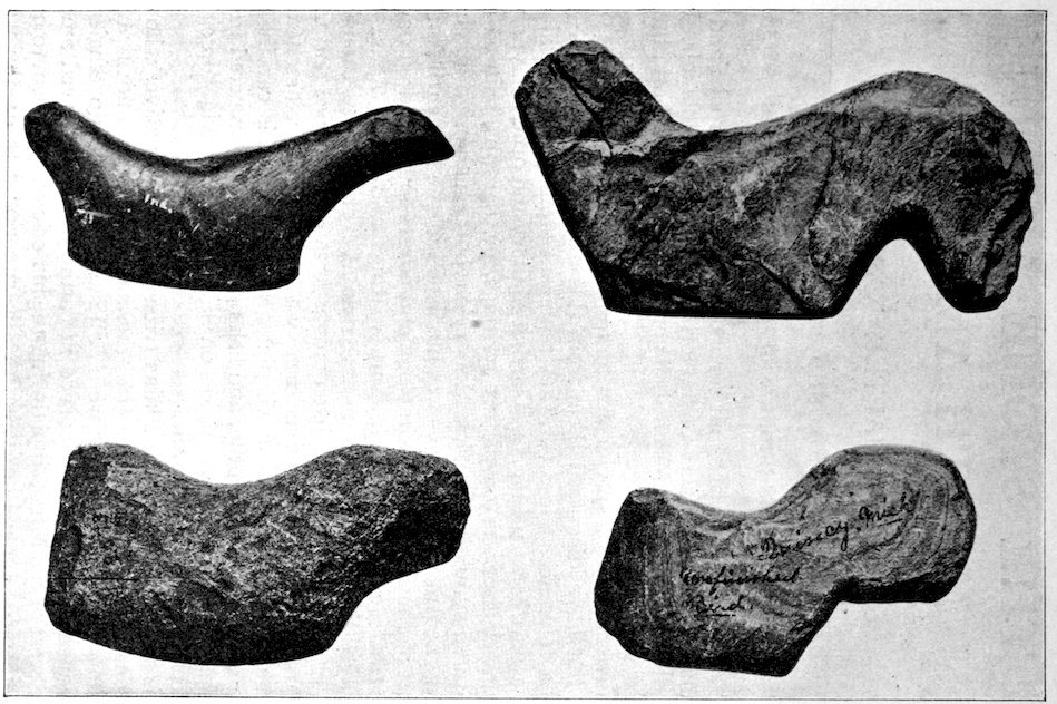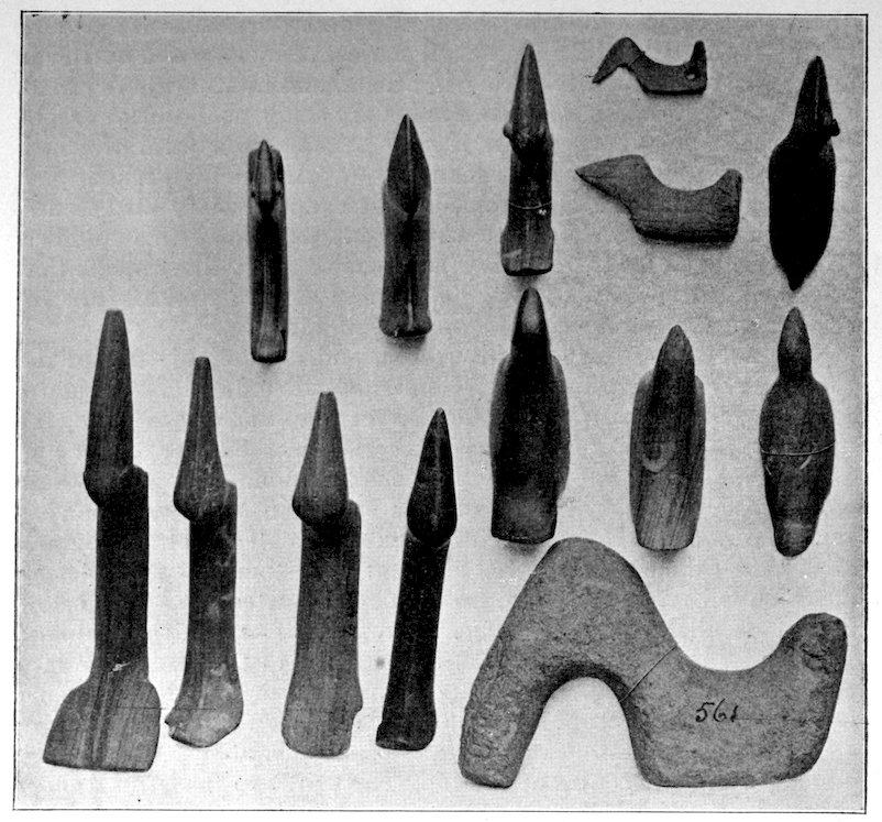 In collecting numbers of these unfinished bird-stones, my object was to prove that these slender, delicate objects did not indicate European knowledge or influence, but were wrought after much labor from ordinary stone by prehistoric man. None of them show 9the marks of steel cutting-tools. Fig. 400 is the roughest one and yet the ears or eyes stand out in relief. Fig. 399 is interesting in that it shows three on which the result of pecking and battering is in evidence. The one to the left, lower row, has been pecked, and ground, and was in process of being polished when the work ceased.