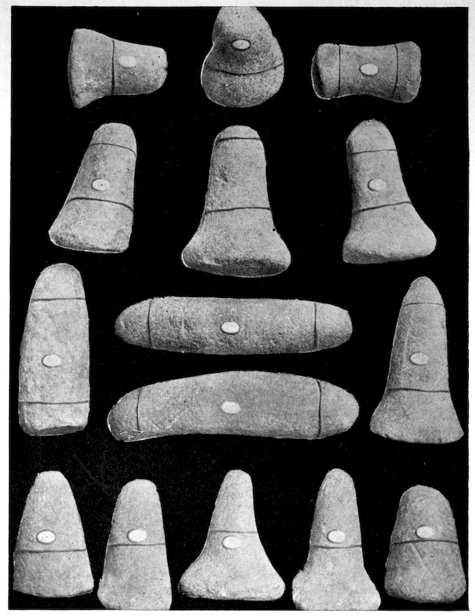 There are presented, all told, in this chapter, sixty bird-stones. It would be possible for me to present ten times this number. There are included in the series numbers of effigy-like objects that might not be classed by other observers as bird-stones. For instance, the central specimen, top row, of Fig. 405.