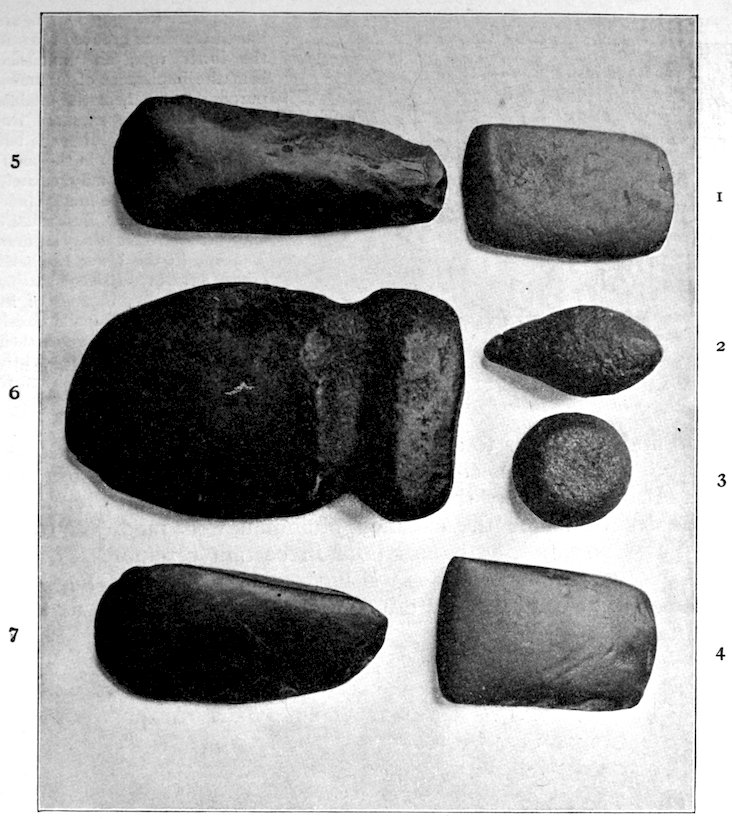 Two grooved effigies and two celts, from the Bahama Islands, West Indies. Reproduced in natural colors. B. W. Arnold’s collection, Albany, New York.