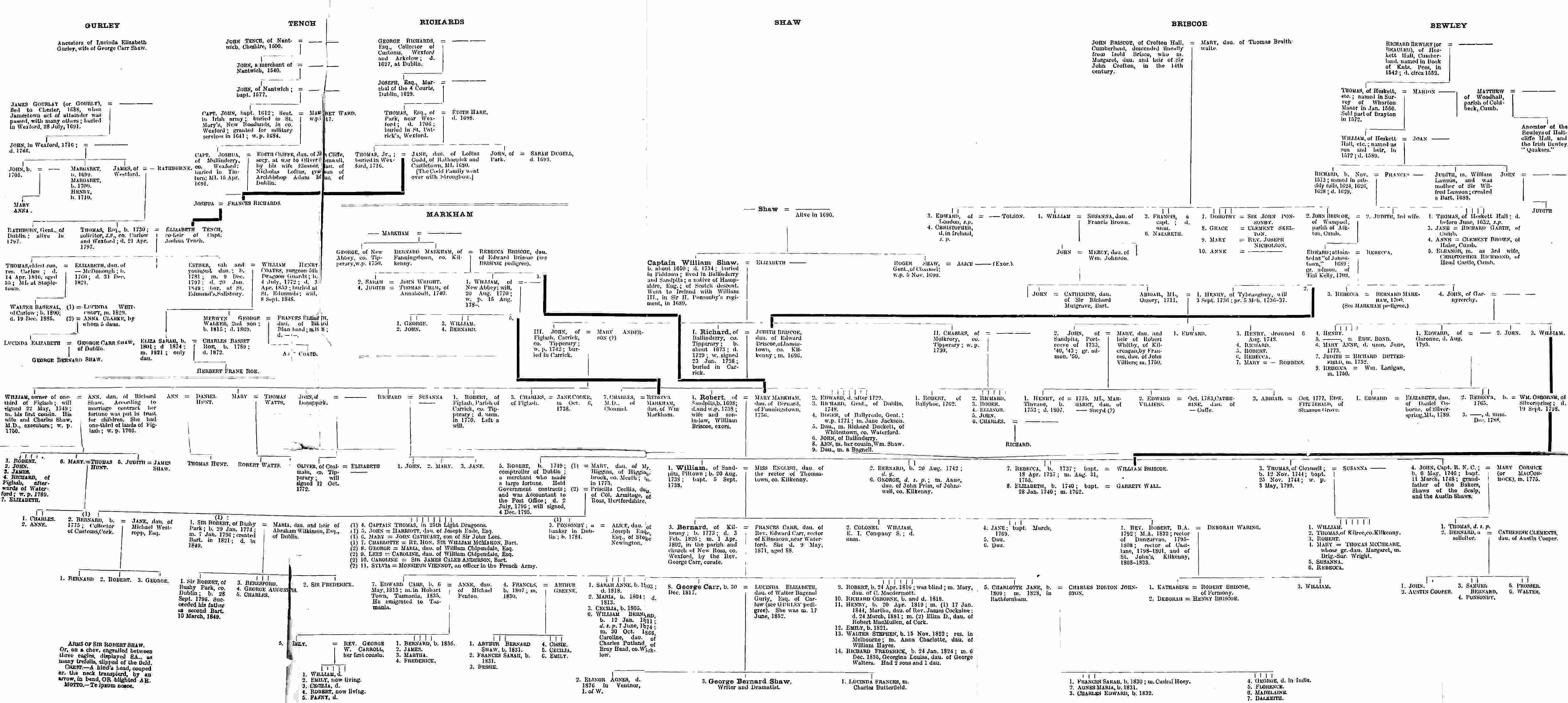 Mr. Shaw is fond of saying: “I am a typical Irishman; my family came from Hampshire.” His lineal ancestor, Captain William Shaw, was of Scotch descent; lived in Hampshire, England; and in 1689 went to Ireland, where the family has since lived. The strains in Mr. Shaw's ancestry are so complicated and interwoven, that it has seemed important to publish a genealogical chart of the Shaw family. The researches were conducted by the expert genealogist, Rev. W. Ball Wright, M.A., Osbaldwick Vicarage, York, at the instance and under the direction of Mr. Shaw himself. The chart, compiled from the data of Mr. Wright, was prepared by the experts of the Grafton Genealogical Press, New York.