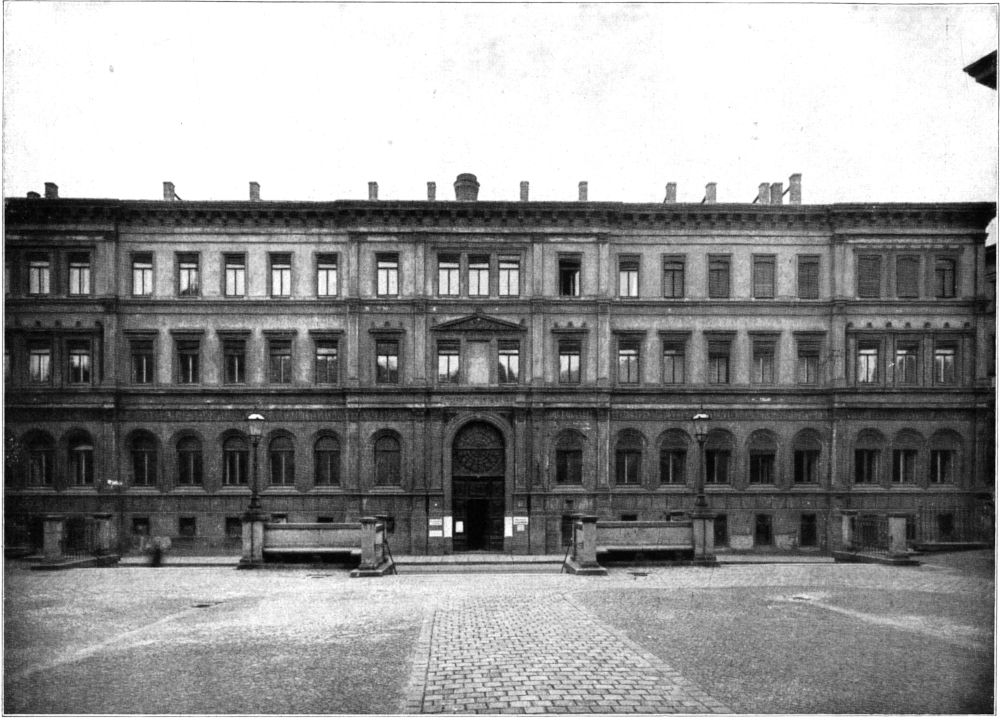 Das Augusteum und das Postgebäude wollten nach dem Bau des Theaters von 1867 und dem projektierten Umbau des städtischen Museums von 1883[283] nicht mehr recht zu dem Gesamtbilde des Augustusplatzes passen. Ihre schlichten Fassaden mußten reicher gegliederten Platz machen, die in der Form der italienischen Renaissance gehalten wurden.