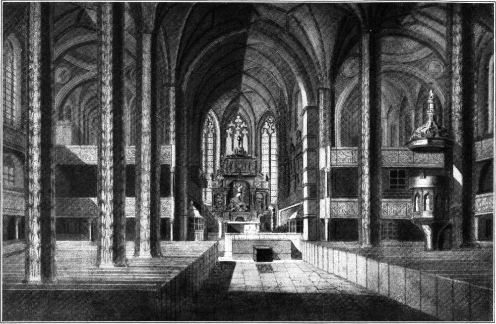 Von dem ursprünglichen Aussehen des Kircheninnern hat man durch zwei kurz vor Dauthes Umbau gemalte Aquarelle Kenntnis, und wenn man auch bedauern mag, daß manche hübsche Einzelheiten völlig verschwunden sind, wird man doch angesichts einer so mutigen und künstlerisch bedeutenden Tat, wie sie diese Umwandlung darstellt, sehr zufrieden sein, daß ein so eigenartiger Baugedanke Verwirklichung gefunden hat. Das hervorragendste Einzelkunstwerk aus der älteren Kirche ist die wahrscheinlich 1521 entstandene Kanzel, an deren Brüstungswänden unter reichen gotischen Baldachinen die Gestalten des Schmerzensmannes und der vier Kirchenväter in hohem Relief erscheinen. Sie ist ein Zeugnis für die mit dem zu Beginn des sechzehnten Jahrhunderts rasch aufsteigenden Reichtum der Stadt verbundene letzte üppige Blüte der Spätgotik in unserer Gegend.