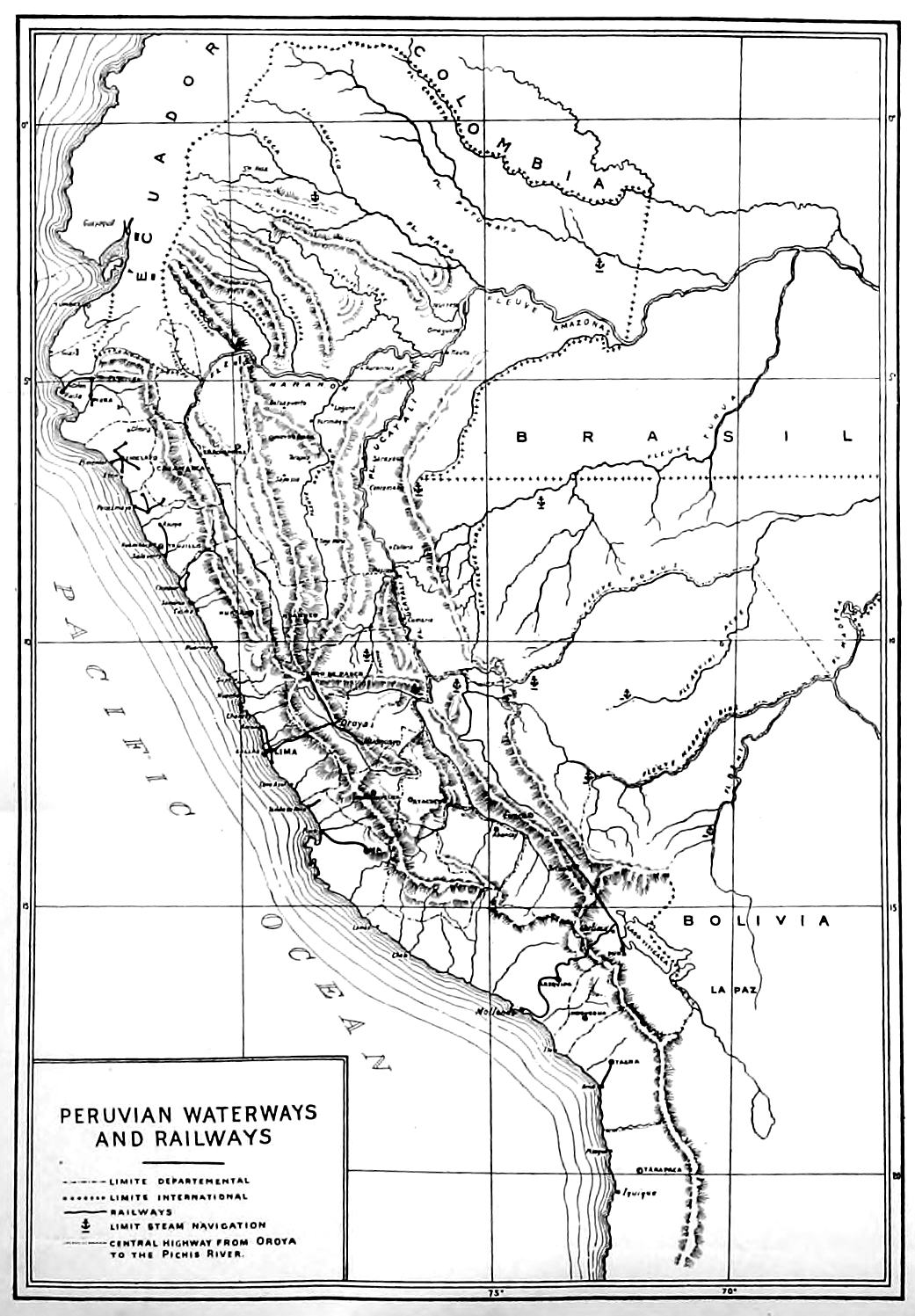 | Importance of River System—Existing Lines of Railroads—Pan-American Links—Lease of State Roads to Peruvian Corporation of London—Unfulfilled Stipulations—Law for Guaranty of Capital Invested in New Enterprises—Routes from Amazon to the Pacific—National Policy for Their Construction—Central Highway, Callao to Iquitos—The Pichis—Railroad and Navigation—Surveys in Northern Peru—Comparative Distances—Experiences with First Projects—Future Building Contemporaneous with Panama Canal | 137 |
