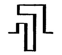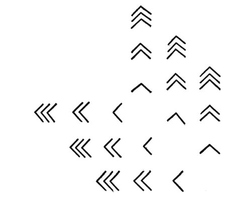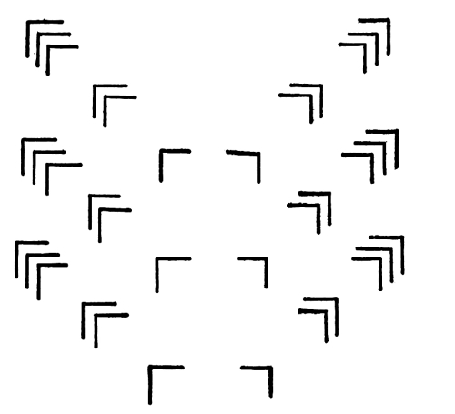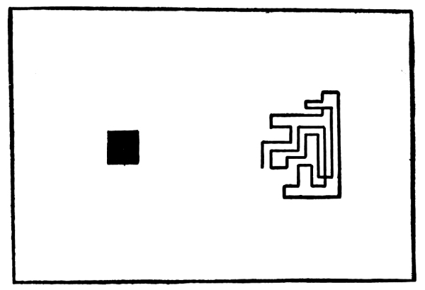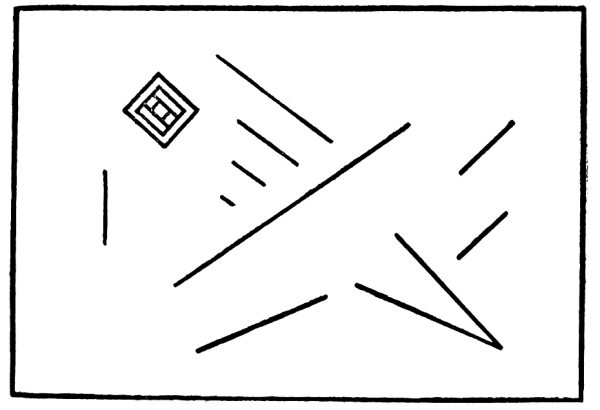 In this case we have an approximate balance in which the force of a symmetry, with contrasting edges, on one side, is balanced by contrasts and certain movements on the other. If I should turn down the upper spot on the right, we would feel a loss of balance due to the turning of two movements, which combine to make one movement to the right, into two movements down to the right. If I should increase the force of the symmetry, by filling in the center with black, it would be necessary either to move the symmetry nearer to the center or to move the opposite attractions away from it. An unstable attitude in the symmetry would have to be counteracted, in some way, on the other side.