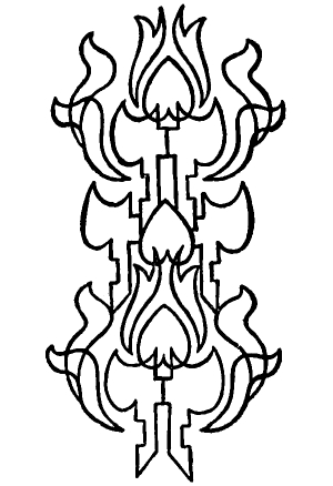 184. When any unbalanced composition of tones is singly inverted upon a vertical axis and the movement of the composition follows the axis, either up or down, and this movement, up or down, is repeated, up or down, we get forms of Tone-Rhythm which are also forms of Symmetrical Balance. In the inversions and repetitions of the tone-composition we have Tone-Harmony. As the tones in the repeated composition have certain positions, measures, and shapes, the Harmony, the Balance, and the Rhythm are of Positions, Measures, and Shapes as well as of Tones; so we get the combination of all the terms of Design in all the three modes of Design.