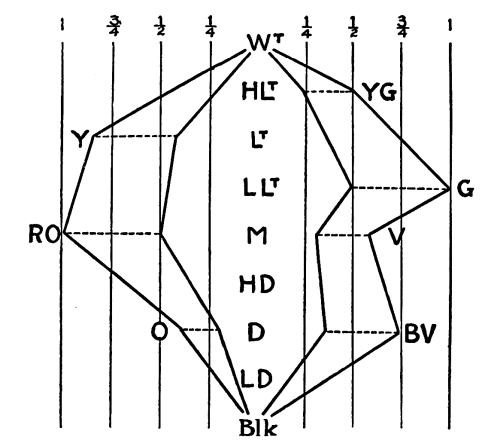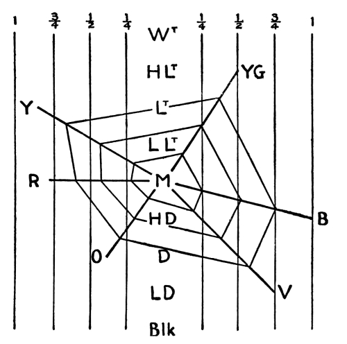 173. The reader will find the Diagram of Values and Colors (No. 5) very useful in making calculations for tone-balances, so far as value-contrasts and color-contrasts are concerned, leaving out considerations of color-intensity.