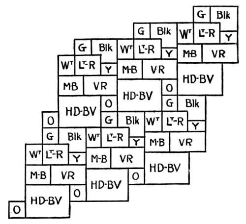In this case, disregarding possible differences of intensity, there will be a rhythm of color moving from right to left and a rhythm of values moving from left to right. Assuming that we are equally attracted by corresponding value and color-contrasts, these two rhythms, when produced, will neutralize one another and we shall have [Pg 184] an illustration of Tone-Balance rather than Tone-Rhythm. If corresponding color and value-contrasts are not equally attractive we shall have an unequal tug-of-war between the two rhythms.