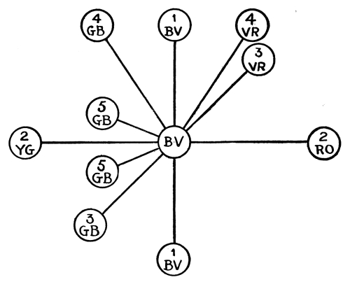 The various types of tone-balance are shown in the above diagram. The tones which balance, one against the other, on the ground-tone of Blue-Violet, are the tones marked by the same number.