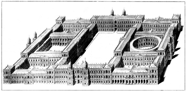 [Pg 38] Sir William Chambers, the last of the Inigo Jones and Wren succession, speaks especially of the circular court described above. There are few nobler thoughts, he observes, in the remains of antiquity. The effect of the building, properly carried out, would have been surprising and great in the highest degree. The diameter of the court was to be 210 feet, the ground floor being an open arcade or cloister.