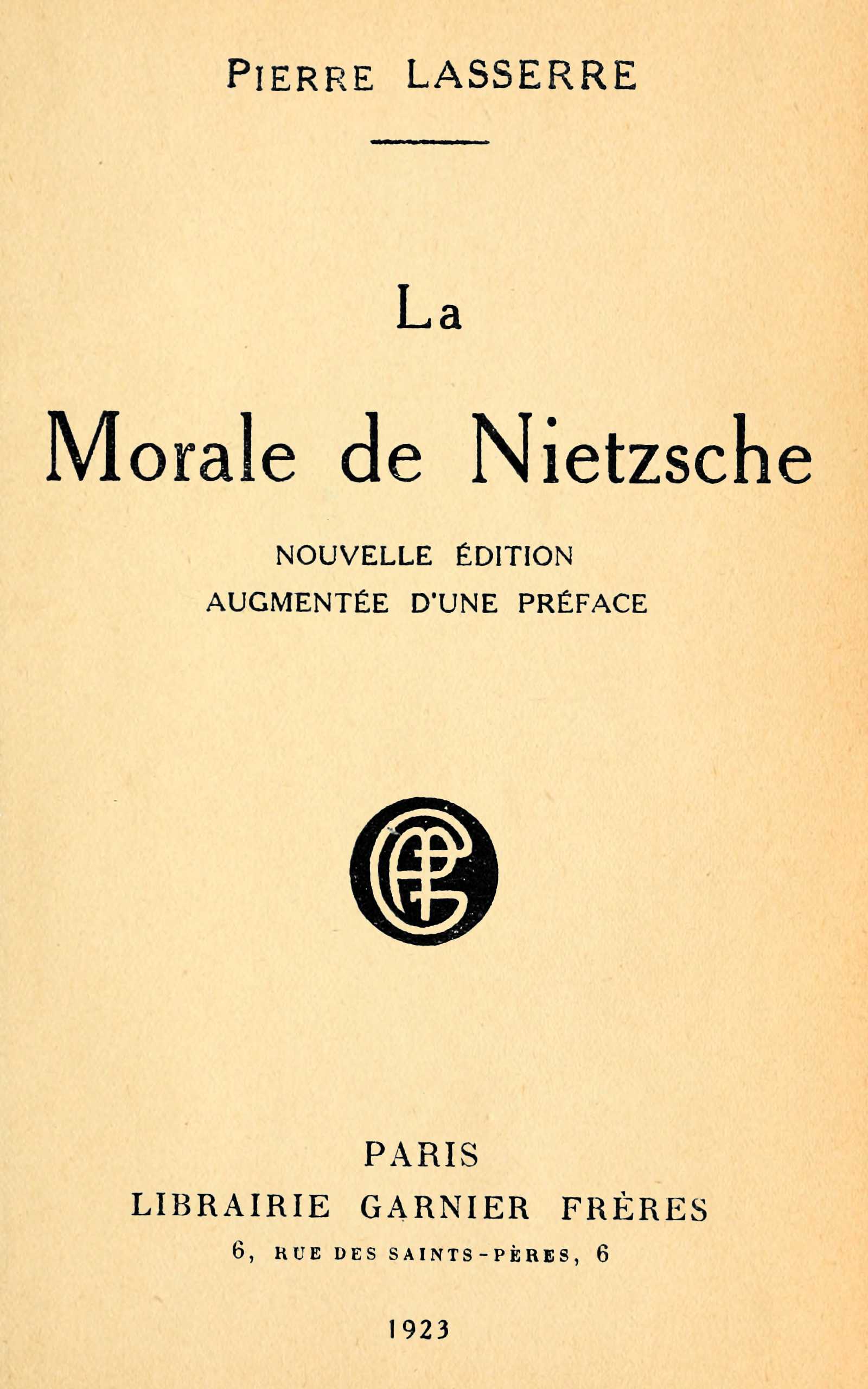 Publié, il y a près de trois ans dans un recueil périodique, mais composé il y en a plus de cinq, c’est-à-dire avant que Nietzsche ne fût encore lisible en français, ce travail nous avait paru perdre toute utilité à la suite de la belle et complète traduction du grand psychologue donnée par M. Henri Albert et ses collaborateurs.