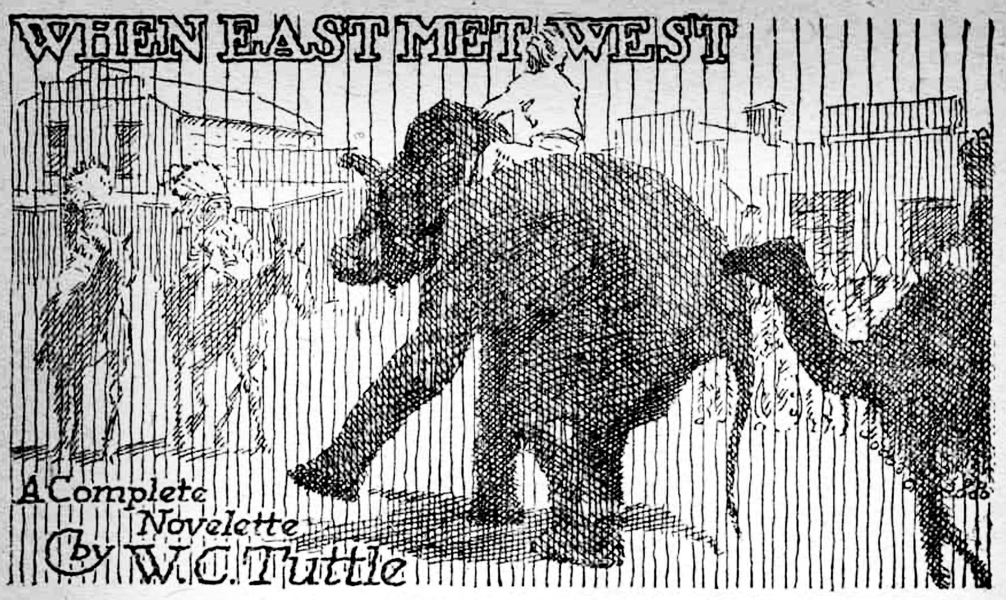 I seen all this in a lot less time than it takes to tell it. The thing is comin’ too danged fast, I sabe that much, and I know that an automobile don’t scare at elephants. A runaway horse goes past me, hits its rump against the platform of Victory and Progress and skids the thing aside.