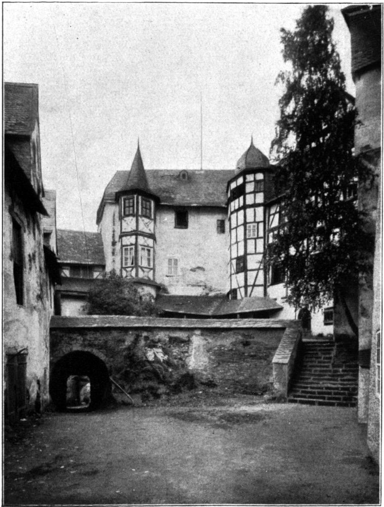 Der Südflügel des Schlosses, wie er noch heute steht, der massive Teil des Nordflügels bis zu gleicher Länge, der starke Neue Turm, sowie der mittlere Schloßhof überhaupt stammen aus Balthasars Bauzeit. Daß außerdem noch Fachwerk- und leichte Holzgebäude vorhanden waren, die restlos verschwunden sind, muß immer bedacht werden. Bis 1491 ging die Zufahrt zur Burg über die Felsen hinauf, die gesprengt wurden, um Bauplatz für den Südflügel zu gewinnen. Dadurch entstand der Tunnel, über[29] dessen Eingang Balthasars Wappen und Namen prangten und, wenn auch zertrümmert, noch zu sehen sind.