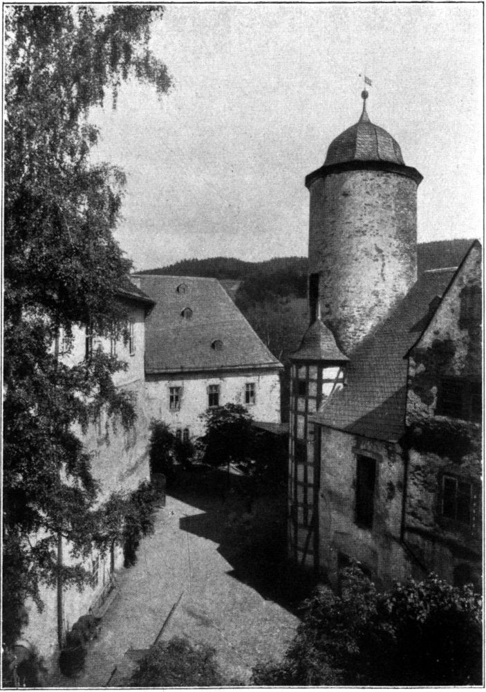 Heinrich XV., 1359–1402, war noch ein Kind, als sein Vater starb. Seine Mutter, zum zweiten Male Witwe[10] geworden, mußte sich fürsorglich ihres Sohnes und seiner Erbschaft annehmen. Heinrichs Halbbruder Gerhard war erfolgreicher, tatkräftiger Staatsmann und streitbarer Held als Bischof von Naumburg und Fürstbischof von Würzburg. Heinrichs Gemahlin, Anna von Gleichen, pflegte besonders ihren Besitz Remda. Das Leutenberger Schloß wird 1375 kriegsbereit genannt. Es mag um diese Zeit für die kinderreiche Herrschaftsfamilie und deren Hofhaltung erweitert worden sein durch Anbau nach Norden hin, soweit heute das massive Haus am obersten kleinen Schloßhof reicht.