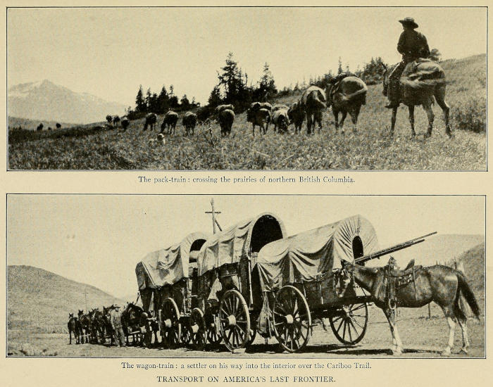 In the great march which substituted the wheat-field for the desert, the orchard for the forest, the work was done by the hardiest breed of adventurers that ever foreran the columns of civilisation—the Pioneers. And the pioneer has always lived on the frontier. Most people believe that there is no longer any quarter of this continent that can properly be[viii] called the frontier and that the pioneer is as extinct as the buffalo. To prove that they are wrong I have written this book. Though the gambler and the gun-fighter have vanished before the storm of public disapproval; though the bison no longer roams the ranges; though the express rider has given way to the express-train; in the hinterland of that vast region which sweeps westward and northward from the Pecos to the Skeena, and which includes New Mexico, Arizona, California, Oregon, Washington, British Columbia, frontier conditions still endure and the frontiersman is still to be found. In the unexplored and unexploited portions of this, “the Last West,” white-topped prairie schooners—full sisters of those which crossed the plains in ’49—creak into the wilderness in the wake of the home seeker; the settler chops his little farmstead from the virgin forest and rears his cabin of logs from the trees which grew upon the site; mile-long pack-trains wend their way into the northern wild; six-horse Concord coaches tear along the roads amid rolling clouds of dust, their scarlet bodies swaying drunkenly upon their leathern springs; out in the back country, where the roads run out and the trails begin, the cow-puncher still rides the ranges in his picturesque panoply of high-crowned Stetson and Angora chaps and vivid shirt. But this is the last call. It is the last chance to see a nation in the primeval stage of its existence. In a few more years, a very few, there will be no place on this continent, or on any continent, that can truthfully be called the frontier, and with it[ix] will disappear, never to return, those stern and hardy figures—the pioneer, the prospector, the packer, the puncher—who won for us the West.