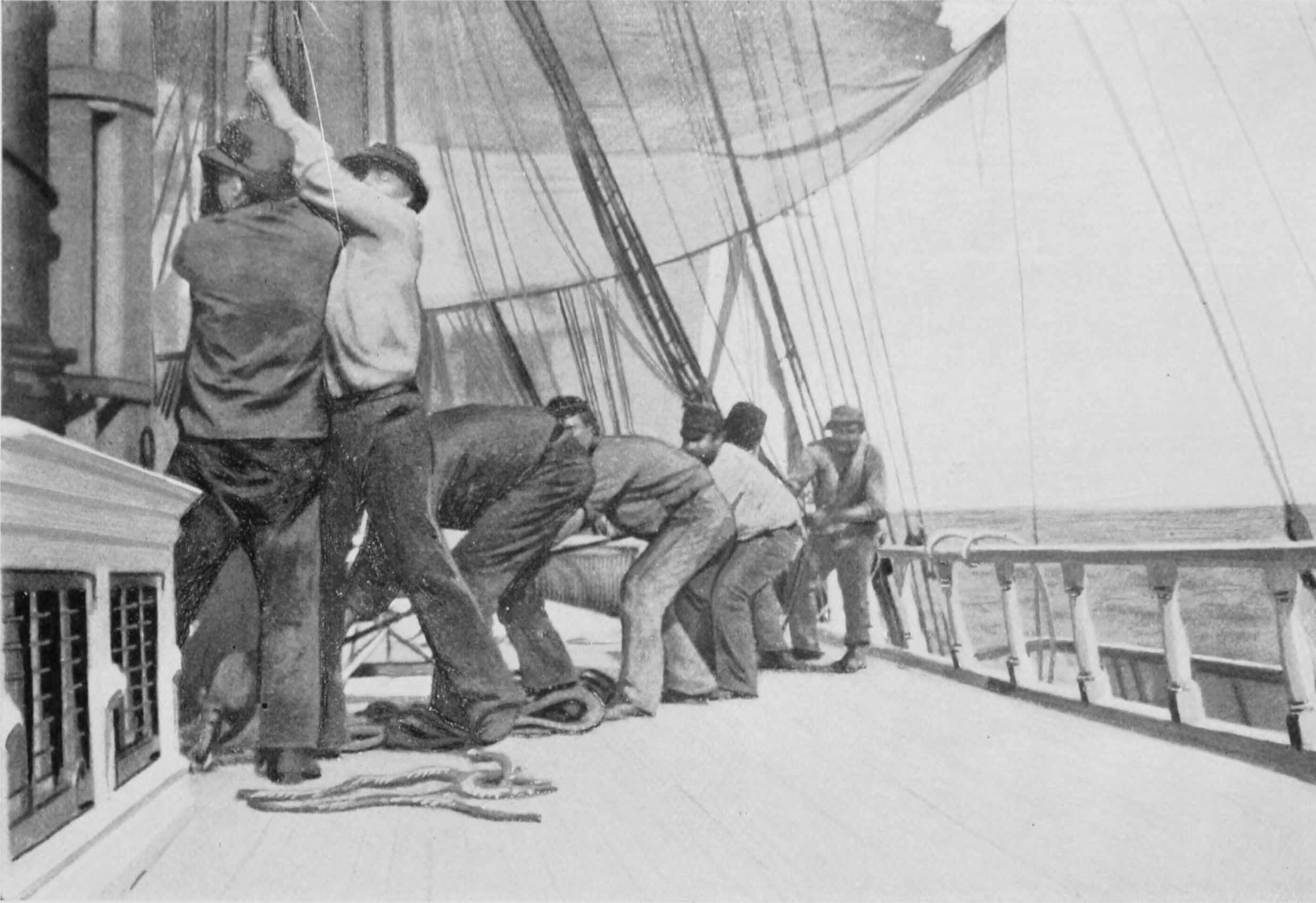Before dark, though, everything had been straightened out, and the ropes coiled away over the pins, and the decks at length began to assume that well-ordered appearance so attractive in a large square-rigger.