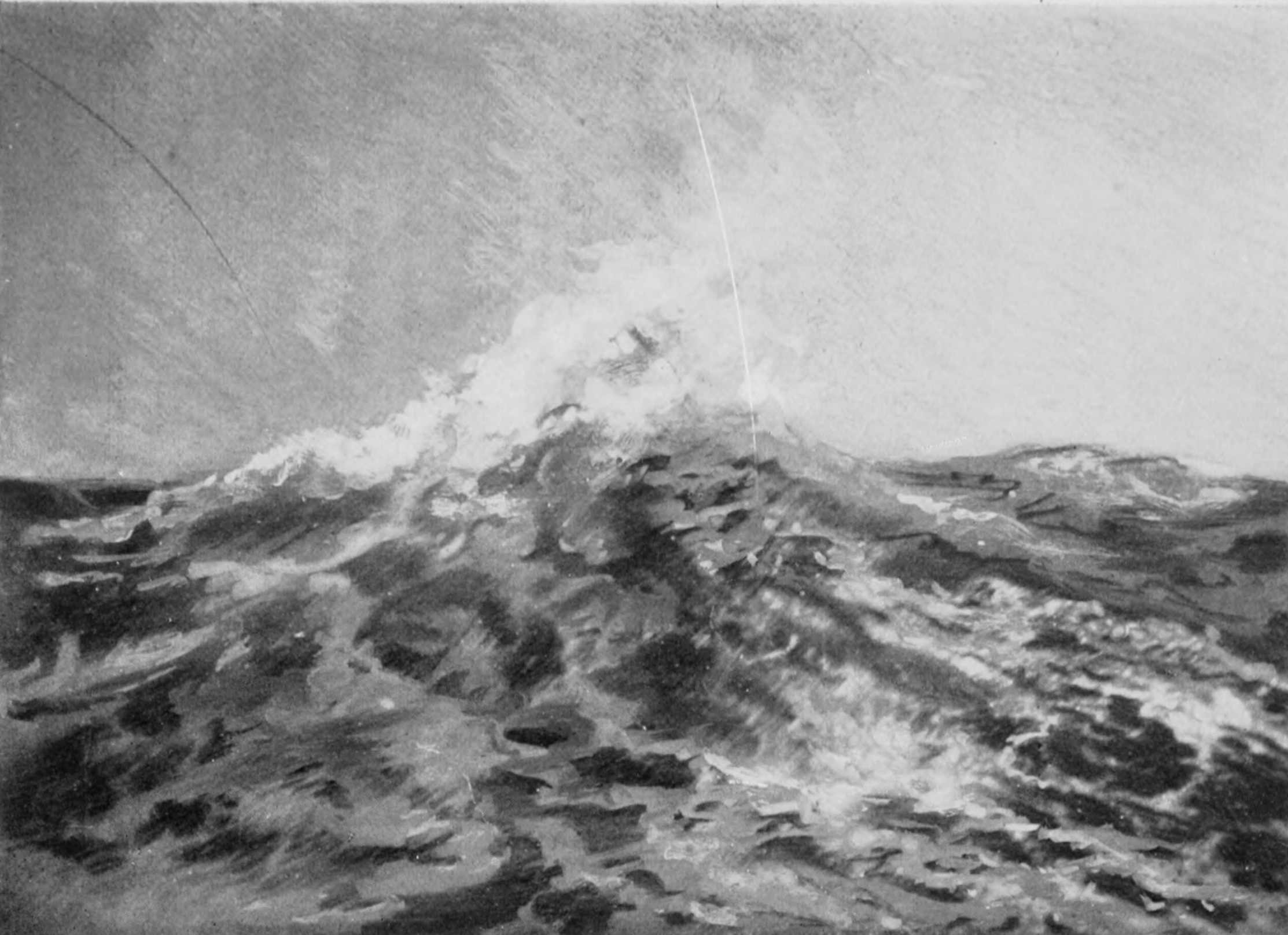 Just as we had finished writing up our journals yesterday afternoon there came a loud patter of rain overhead and a heavy puff from the eastward that laid the ship well over. Still, we didn’t pay much attention to it for some time; but, finding that we moved steadily along without righting, I went on deck to find the ocean covered with white-caps to the horizon, which was thick with dense, gray, very windy-looking clouds. We were flying through the water at ten knots, and heading up north by west true, which was very fine; but, even as we looked, there came a slight but portentous heave from ahead that foretold a northerly swell. And so it proved, for by 8 P.M. our progress had dwindled to six knots, as we went pitching and diving into an ugly head-sea. It is astonishing how even a moderately heavy swell from ahead will check the speed of a ship, even with a strong wind blowing. A steamer will cleave right through a tall swell without any perceptible difference in her speed, a fact proved to us once when, in crossing the Atlantic in the “Etruria,” we encountered a head-sea that buried the entire bows at every plunge; yet the speed was lowered by only a quarter of a knot. Even a sailing yacht will overcome a head-swell in a very creditable manner; but when a massive, clumsy square-rigger runs into one,[Pg 379] farewell to even a moderate run. She stops at every sea for an appreciable time, till the impetus of so ponderous a mass asserts itself and she tumbles into the next valley. So it was with us all through the night, though we made good a fine course north-northwest.