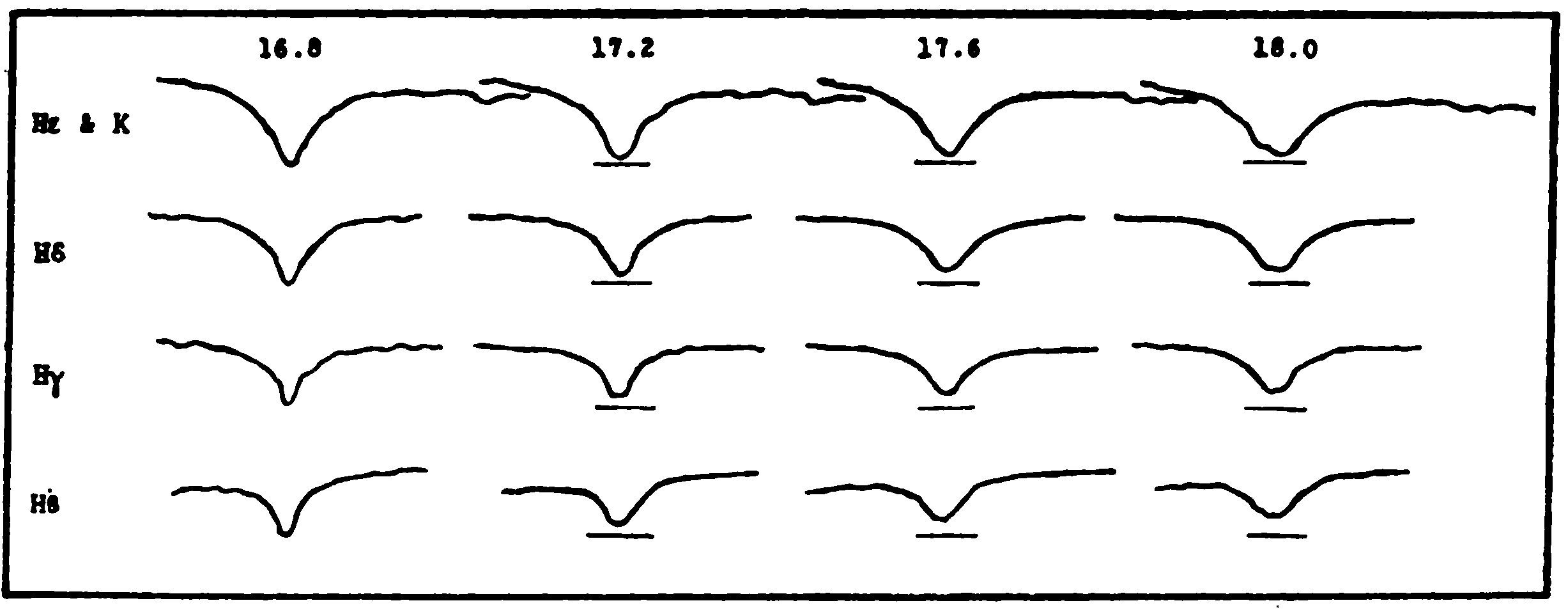For the wider lines, especially those that are strong and heavily winged, the intensities derived in this paper are probably of the right order. Probably, however, the dispersion used is too small to reproduce satisfactorily the detail at the centers of lines as narrow as those of such stars as α Cygni and β Orionis. The difficulty introduced does not involve inaccuracy of plates, microphotometer, or process of measurement; it is concerned solely with the fact that the spectral region examined is so narrow that, with the dispersion used, the grain of the plate is not fine enough to reproduce the spectral detail. The same difficulty would prevent any recognition of the double reversal of the solar H and K lines, if they were studied with the present dispersion.