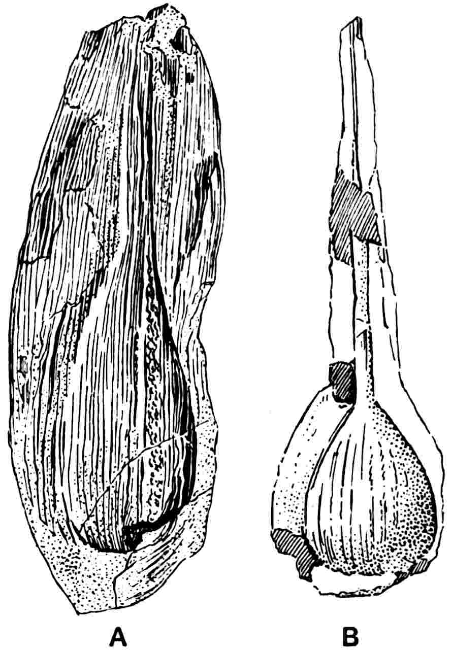 A Rhaetic Scanian species originally referred by Nathorst[1678] to Nilssonia but later removed by him to Dioonites[1679] and in 1909 reinstated in Nilssonia[1680] on the ground that the lamina covers the upper face of the rachis. The segments are fairly uniform in breadth and linear; they reach 10 cm. in length and are usually 5–7 mm. broad; the lamina is slightly tapered towards the apex (fig. 619, B). There are 3–10 parallel grooves on the upper 573face of the segments and between each pair is a single unbranched vein. In close association with portions of three fronds of this species Nathorst found several oval bodies, 1 cm. × 7 mm., which he at first regarded as ‘antherangia’ comparable with the sporocarps of the Hydropterideae, but an examination of the carbonised tissue demonstrated that the small rounded bodies contained in each of the ‘antherangia,’ originally believed to be pollen-sacs, are grains of resin internal to a cuticle of thick-walled cells and probably formed by secretory sacs in a fleshy tissue. Internal to the resin-bodies is a second cuticle which may be the remains of a nucellus, the outer cuticle and the resin belonging to the sarcotesta. Nathorst’s careful examination of these fossils shows that they are seeds (fig. 619, A) and were probably borne on plants of N. pterophylloides, though an accidental association is not improbable.