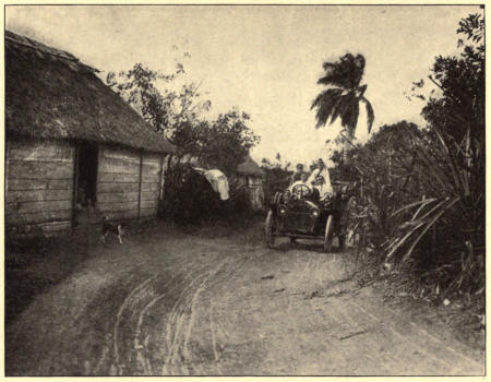 A mere path straggled over and among the hills and was lost in the great patches of native rock. We began to take the country seriously. Trepidation mingled with curiosity. Once in a while a good sort of winding dirt road gave promise of speed, only to change, like a dissolving lantern slide, to a staggering trail over the rocks or between them. The stones increased in number and in size. Each occasional break in the bumping, swaying, swinging, car-racking, tire-tearing progress became shorter. We forgot the stately palms, the queer huts, and the beautiful red flowers. We did not even hear the evening song of the many birds.