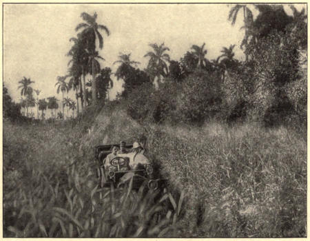 Going back from the sugar mill, in the early morning, to the farmhouse where we had left El Toro, we noticed two chances of crossing the muggy river where automobiling in Cuba had ceased the night before. One place was wide, low, and flat. It meant long hours of tedious filling in with brush. The other was a narrow cut between two precipitous walls. We chose [92]the cut, for it required only a few minutes to fill the narrow bottom with enough brush to allow the car to be driven down one hillside and up the other as fast as all its power could take it.