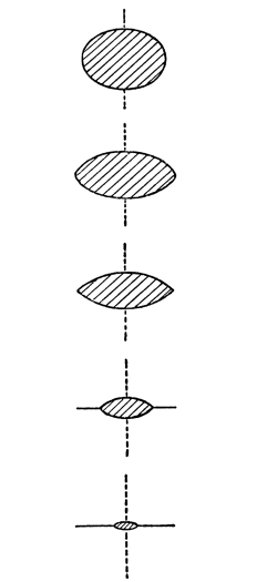[5] The simplest definition of an ellipse is that it is the curve drawn by a moving point P which moves in such a way that the sum of its distances PS, PT from two fixed points S, T remains always the same. In practice we can most easily draw an ellipse by slipping an endless string SPTS round two drawing pins S, T stuck into a drawing board. Stretch the string tight with a pencil at P, and on letting the pencil move round, keeping the string always tight, we shall draw an ellipse. If the pins S, T in the drawing board are placed near to one another the curve described by the pencil P is nearly circular. The ratio of the distance ST to the length of the remainder of the string SP + PT is called the “eccentricity” of the ellipse; it is necessarily less than unity, because two sides of a triangle are together greater than the third side.