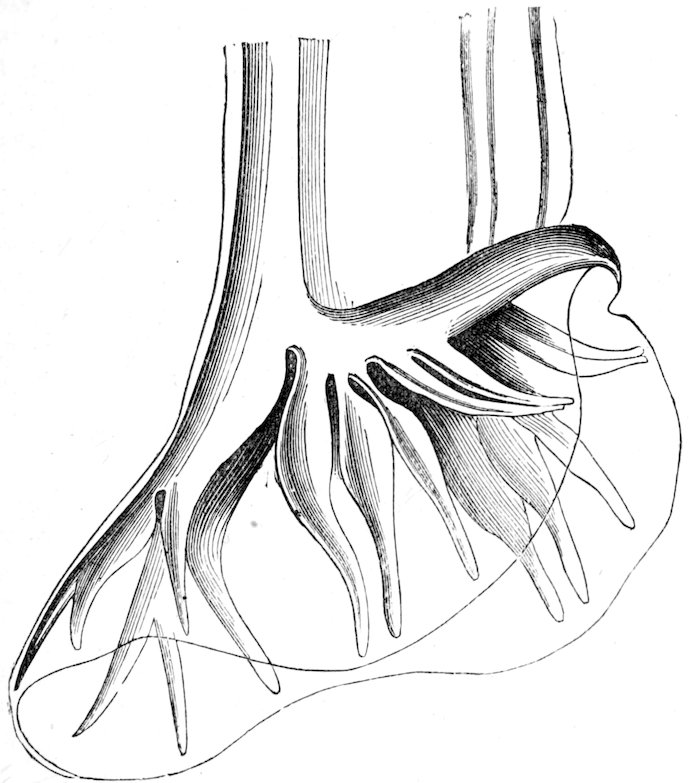 is at most scarcely one-sixth of an inch long, and consists of only three or four joints, often lives in large numbers in the intestine of the dog without injuring its host, but causes huge cysts (from the size of a pigeon’s egg to that of a child’s head) in the liver, lungs, or other organs of man, pig, and ruminants. These cysts are of the type represented 240on the right of Fig. 138. They may prove fatal, owing to the pressure they exert in the organs containing them and the blood-vessels of the same.