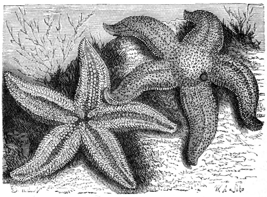 Fig. 145.—The Common Starfish (Asterias rubens), seen on the right from above, on the left from below.