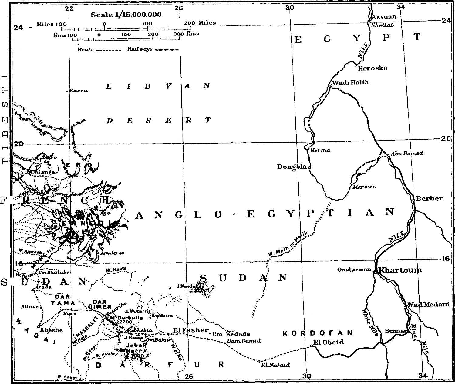 In the first place, the great geographical problem of ancient fluvial communication between the basins of the Chad and the Nile is definitely solved; the mountainous barrier encircles the basin of the Chad from the Toummo Mountains on the north to the Djebel Marra on the south-east, passing through the massif of Tibesti, the plateau of Jef-Jef, the tablelands of Erdi and Ennedi, the hills of Zagawa, and the mountains of western Dar Four.