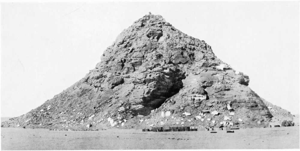 To the south-west of Dakhla Oasis there stretches a broad tract of rising ground, with the Gilf Kebir and the peaks of Arkenu, Owenat, and Kissu as conspicuous features. On either side of this tract the general level falls, on the one hand towards Kufra and Cyrenaica, and on the other hand towards the Nile. The Gilf Kebir is a great broken plateau of sandstone, rising very nearly to the 1000-metre contour and stretching in a direction a little west of south for over 100 kilometres. I saw the south end of this plateau from several points on the way from Terfawi to Owenat when travelling with Prince Kemal el Din in 1925, and fixed its position by compass-bearings. As seen from the south, the plateau appeared to be merely a flat-topped hill; its true form and extent were discovered by the Prince in the following year, when he passed along its eastern foot on his way from Pottery Hill to Owenat. The highest peak of Arkenu, in about lat. 22° 17′, long. 24° 46′, I estimated to rise to approximately 1410 metres above sea. The altitude of Gebel Owenat far transcends Hassanein Bey’s previous estimate of 1100 metres; a trigonometric measurement which I made in 1925 gave its summit as 1907 metres above sea. The general level of the ground at the foot of Owenat I found to average about 600 metres, thus agreeing with Hassanein Bey’s figures. Gebel Kissu, though lower than Gebel Owenat, is considerably higher than Gebel Arkenu, and being an isolated mountain with a single well-marked peak, it forms a very conspicuous landmark; my trigonometric determination gave 1726 metres for the altitude of the peak above sea.