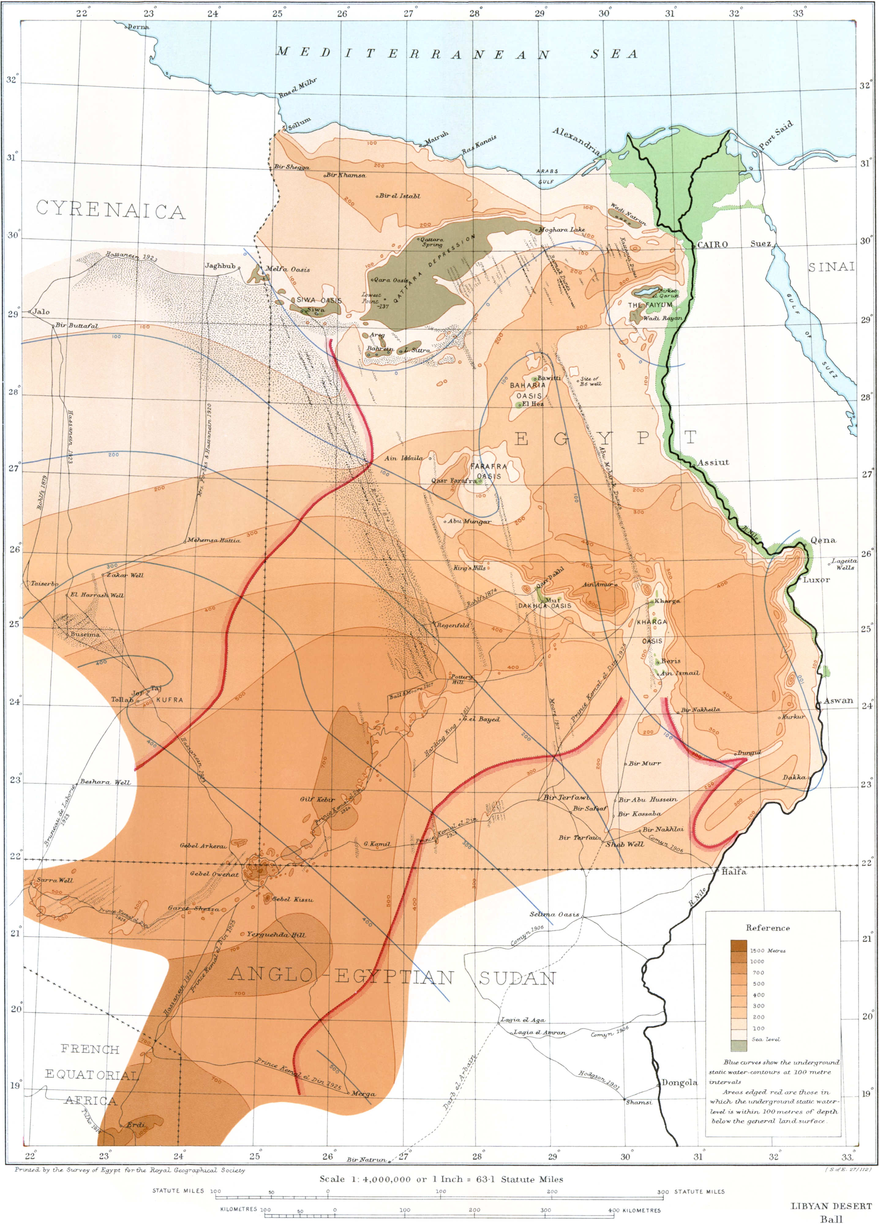 The idea that a “dry river” exists in the Libyan Desert is a very old one, and seems to have had its origin in the fact that barren depressions in that region are sometimes called by the local Arabs Bahr bela ma, that is, “sea without water.” But the Arabic word bahr, which properly means a sea or a lake, as in Bahr Lot (the Dead Sea), is also applied in Egypt and the Sudan to a river, as in Bahr el Nil (the Nile) and Bahr el Azrak (the Blue Nile).[5]