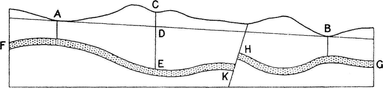 In the diagram, FEKHG represents a water-conveying stratum, folded throughout its course and faulted at HK, but having a general downward slope from F to G. A and B represent points at which the water just rises to the ground-level, either through natural fissures or in artificial borings. The straight line drawn through A and B represents very approximately the static level at any point between A and B, that is, the level to which the water would rise in bores carried down to the water-bearing bed. A boring at C, for instance, would have to go down to E to tap the water, but once the bed was tapped the water would rise in the bore as far as D. At the fault HK, the pressure of the water at K will cause it to rise through the crushed rock at the fault-plane and re-enter the porous stratum at H. If there is a considerable outflow at B, and the fault-plane is a very narrow fissure, we may expect some drop in the line AB over the fault, by reason of the extra frictional absorption of head at this place. But unless the thickness and degree of permeability of the fault-rock are markedly different from those of the sandstone bed itself, the drop of pressure will not greatly disturb the general slope AB. In any case it is apparent that the level of the static water-surface at any place between A and B is capable of being estimated with a far closer degree of approximation than is the level of the water-sheet itself. We may therefore justifiably assume a uniform gradient for the static level between points at which that level is known, disregarding folds in the strata; and though we cannot entirely allow in detail for unknown faults and variations in permeability, it must be borne in mind that the total effect of all the unknown factors between any two known points is already automatically allowed for in our data. It is only the variations from uniformity, due to the unknown distribution of the faults and of the departures from the average permeability, which can affect us; and these variations and departures are probably but small in most of the great unexplored areas of the south-west of Egypt, where the geological structure, from all we know of it, appears generally to be remarkably uniform.