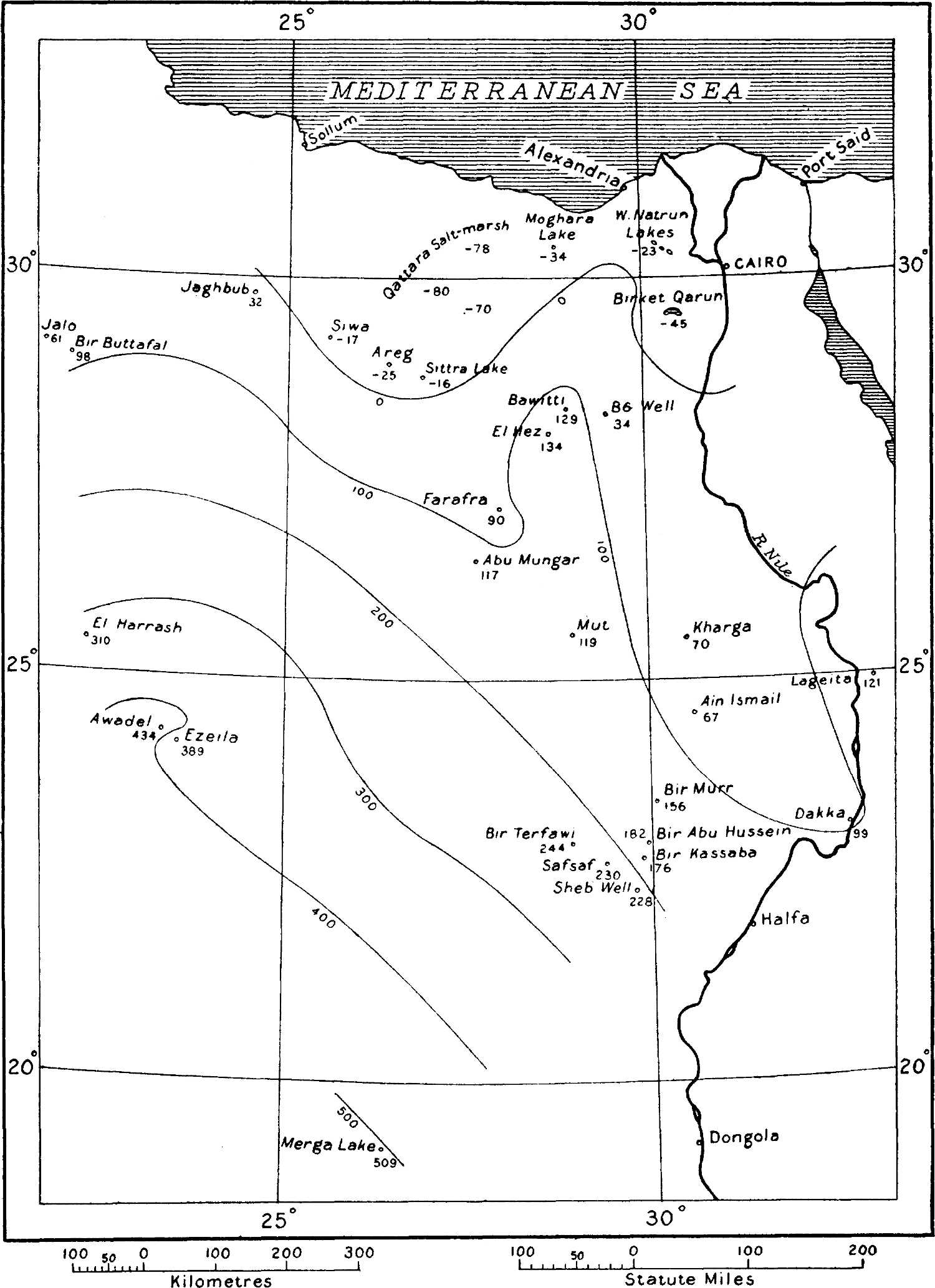 A study of the contoured map seems to me to be absolutely conclusive on the question at issue, for it indicates clearly that at no time within the geologically recent period can there have been any such continuous channel as has been supposed. Let us try and trace, with the aid of the map, the most likely course along which the ancient Libyan Nile-branch, if ever one existed, must have flowed. Starting from the Nile in the neighbourhood of Dongola, we observe that the lowest possible track is through Sheb towards Kharga. But Sheb can only be reached after passing over some 350 kilometres of desert lying well above the level of the Nile at Dongola, which is about 230 metres above sea. It is, of course, quite[31] conceivable that even within geologically recent times the Nile at Dongola may have been considerably above its present level; so that we may pass over this first difficulty as not being definitely conclusive against the hypothesis we are pursuing. From Sheb to the south end of the Kharga depression there is a drop of about 160 metres, so that up to this point a channel may have been possible. But from here onwards, difficulties come in. If we turn northwards, we soon encounter the north wall of Kharga, rising to 300 metres above sea-level; so there is no continuing that way. Instead, we turn westwards towards Dakhla. But from Kharga we have to pass over ground reaching very nearly to the 200-metre contour for some 80 kilometres to enter the Dakhla depression, where we drop to a level of 119 metres. We have to traverse some 15 kilometres at altitudes above 200 metres to reach Abu Mungar, where the level is 117 metres; then a further 12 kilometres lying above the 200-metre contour to get to Farafra, where the level descends to about 90 metres. To get out of Farafra, we have again to traverse country lying over 200 metres above sea, whether we choose a north-westerly route viâ Sittra to the Qattara depression, or a north-westerly one viâ Baharia to the Wadi Rayan and the Faiyum. Taking the first of these alternatives as being the shorter, we cross some 30 kilometres of ground above the 200-metre level, and a further 120 kilometres lying between the 200- and 100-metre contours, before reaching the Qattara depression. And once we are in the Qattara depression (the lowest point of which is 134 metres below sea), there is no possibility of reaching the Mediterranean except by crossing a considerable tract where the ground-level is over 100 metres above sea-level.