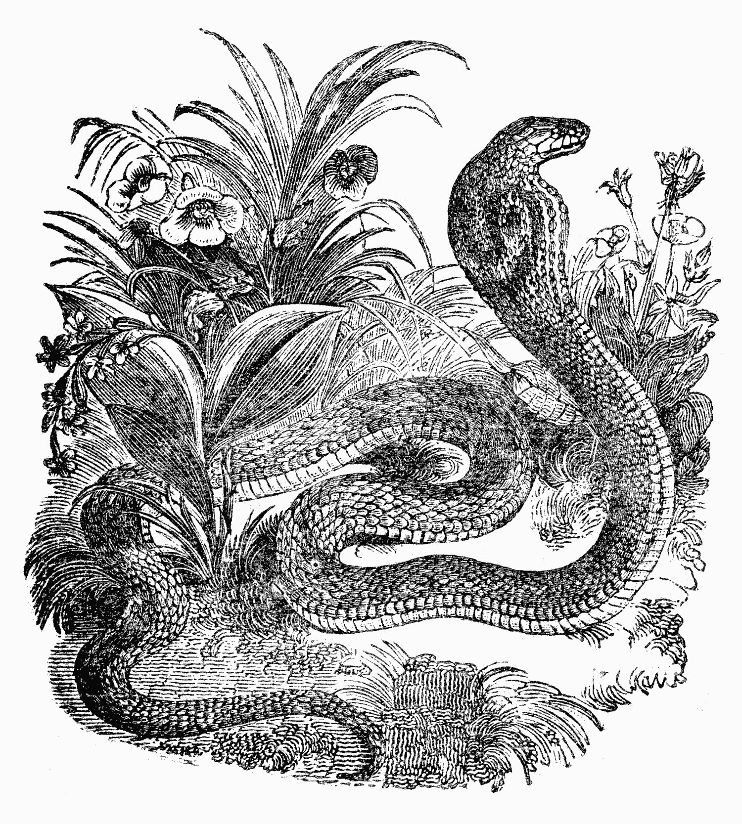 The serpents of South Africa, commonly accounted the most dangerous, are the Cobra-Capello, (or hooded snake,) the Puff-Adder, and the Berg-Adder (or mountain snake.) The first of these is exceedingly fierce and active, and sometimes, it is said, attains the formidable length of ten feet; I have, however, never met with any of much more than half that size. The Cobra has been known to spring at a man on horseback, and to dart himself with such force as to overshoot his aim. The Puff-Adder, on the other hand, is a heavy and sluggish animal, very thick in proportion to its length, and incapable, when attacked in front, of projecting itself upon its enemy. To make amends, however, it possesses the faculty of throwing itself backward with perilous and unexpected effect; but its disposition is inert, and unless accidentally trod upon or otherwise provoked, it will seldom attack mankind. The Berg-Adder, though much smaller in size than either of the preceding, is generally considered not less deadly, and it is the more dangerous from its being less easily discovered and avoided.
