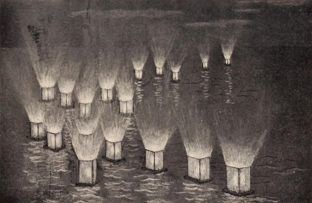 I happened to be at Yaidzu during the three days of the Bon or Festival of the Dead; and I hoped to see the beautiful farewell ceremony of the third and last day. In many parts of Japan, the ghosts are furnished with miniature ships for their voyage,—little models of junks or fishing-craft, each containing offerings of food and water and kindled incense; also a tiny lantern or lamp, if the ghost-ship be despatched at night. But at Yaidzu lanterns only are set afloat; and I was told that they would be launched after dark. Midnight being the customary hour elsewhere, I supposed that it was the hour of farewell at Yaidzu also, and I rashly indulged in a nap after supper, expecting to wake up in time for the spectacle. But by ten o’clock, when I went to the beach again, all was over, and everybody had gone home. Over the water I saw something like a long swarm of fire-flies,—the lanterns drifting out to sea in procession; but they were already too far to be distinguished except as points of colored light. I was much disappointed: I felt that I had lazily missed an opportunity which might never again return,—for these old Bon-customs are dying rapidly. But in another moment it occurred to me that I could very well venture to swim out to the lights. They were moving slowly. I dropped my robe on the beach, and plunged in. The sea was calm, and beautifully phosphorescent. Every stroke kindled a stream of yellow fire. I swam fast, and overtook the last of the lantern-fleet much sooner than I had hoped. I felt that it would be unkind to interfere with the little embarcations, or to divert them from their silent course: so I contented myself with keeping close to one of them, and studying its details.