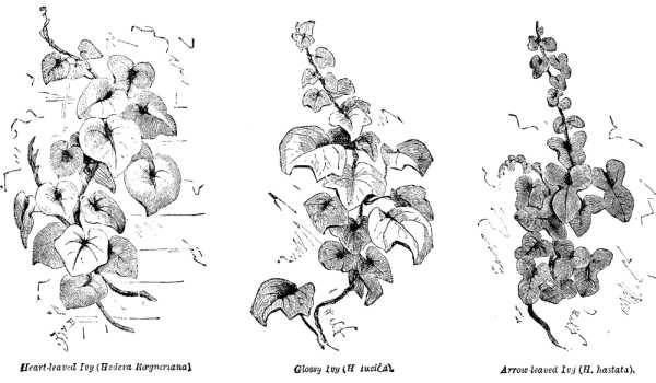 Ivy Leaves.--Common ivy is tolerably plentiful nearly everywhere, but it is not common to find a good distinct series of its many varieties even in the best gardens. Of all the different forms of ivy, I think the large-leaved golden one of the best; certainly the best of the variegated kinds. Raegner's variety is also very bold, its great glossy, heart-shaped leaves most effective. Algeriensis is another fine-leaved kind, the form dentata producing foliage even still larger when well grown. For making low evergreen edgings on the turf, for carpeting banks, the covering of bare walls and the old tree stumps, we have no other evergreen shrub so fresh and variable, or so easily cultivated as are these forms of the ivy green. Perhaps one reason why the finer kinds of ivy are comparatively uncommon is the fact that a strong prejudice exists against ivy in many minds. It is an erroneous notion that ivy injures buildings against the walls of which it is planted; it never injures a good wall, nor a sound house, but on the contrary, hides and softens the stony bareness of the one and adds beauty and freshness to the other.--The Garden.