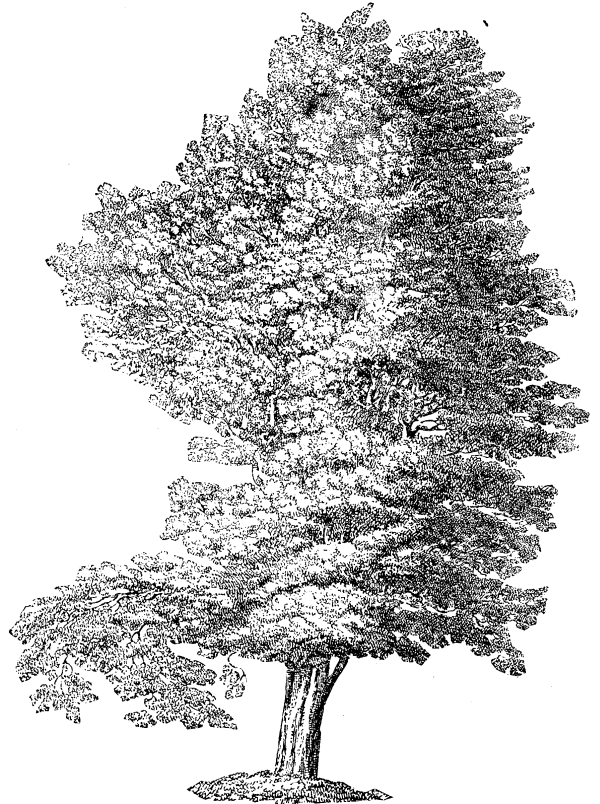 "Having left Ispahan, in order to explore the province of Ghilan, he found this tree in the forests which he traversed before arriving at Recht, a town situated on the Caspian Sea. In this town he had opportunities of remarking the use made of the wood, and of judging how highly it was appreciated by the inhabitants." The first tree introduced into Europe appears to have been planted by M. Lemonnier, Professor of Botany in the Jardin des Plautes, etc., in his garden near Versailles. This garden was destroyed in 1820, and the dimensions of the tree when it was cut down were as follows: Height 70 feet, trunk 7 feet in circumference at 5 feet from the ground. The bole of the trunk was 20 feet in length and of nearly uniform thickness; and the proportion of heart-wood to sap-wood was about three quarters of its diameter. This tree was about fifty years old, but was still in a growing state and in vigorous health. The oldest tree existing in France at the time of the publication of Loudon's great work, was one in the Jardin des Plantes, which in 1831 was about 60 feet high. It was planted in 1786 (when a sucker of four years old), about the same time as the limes which form the grand avenue called the Allee de Buffon. "There is, however, a much larger Zelkowa on an estate of M. le Comte de Dijon, an enthusiastic planter of exotic trees, at Podenas, near Nerac, in the department of the Lot et Garonne. This fine tree was planted in 1789, and on the 20th of January, 1831. it measured nearly 80 feet high, and the trunk was nearly 3 feet in diameter at 3 feet from the ground." A drawing of this tree, made by the count in the autumn of that year, was lent to Loudon by Michaux, and the engraving prepared from that sketch (on a scale of 1 inch to 12 feet) is herewith reproduced. At Kew the largest tree is one near the herbarium (a larger one had to be cut down when the herbarium was enlarged some years ago, and a section of the trunk is exhibited in Museum No. 3). Its present dimensions are: height, 62 feet; circumference of stem at 1 foot from the ground, 9 feet 8 inches; ditto at ground level, 10 feet; Height of stem from ground to branches, 7 feet; diameter of head, 46 feet. The general habit of the tree is quite that as represented in the engraving of the specimen at Podenas. The measurements of the large tree at Syon House were, in 1834, according to Loudon: Height, 54 feet; circumference of of stem, 6 feet 9 inches; and diameter of head, 34 feet; the present dimensions, for which I am indebted to Mr. Woodbridge, are: Height, 76 feet; girth of trunk at 2½ feet from ground, 10 feet; spread of branches, 36 feet.