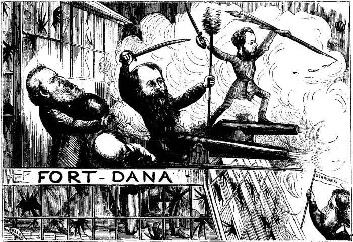 A TABLEAU OF THE DAY. GENERAL DANA, WHO HAS BROUGHT THE FIRE OF THE "SUN" TO BEAR UPON EVERY BODY, NOW BEGINS TO REALIZE THE FORCE OF THE PROVERB—"FOLKS WHO LIVE IN GLASS HOUSES SHOULD NOT THROW STONES." THE INDIAN QUESTION. [AS VIEWED IN THE WEST.]This is our business, understand! You Eastern folks, with tempers bland All get your views at second-hand. We are the ones that take the brunt Of every lively Indian-hunt, So don't be angry if we're blunt. If any body's scalped it's us! So we've a well-earned right to cuss, And you've no right to make a fuss. Talk as you please about their "rights;" That don't include their coming nights, And cutting out our lungs and lights. You get your wife and children shot! (Here it might happen, like us not,) You'll make your mind up on the spot. "Humanity" 's played out for you! You've got some active work to do; No doubt you'll see it well put through. Until you've settled that small bill, (As honorable debtors will,) We fancy you will not keep still. You will admit the tender plea Of "broken faith;" but when you see Your Red Skin, you won't let him be! Just so with us. We don't go back Of our affair! We were not slack In justice to this Devil's pack! They settle with the wrong concern; And as they never, never'll learn, We shoot 'em, and don't care a dern! EDITORIAL WASHING-DAY IN NEW-YORK.