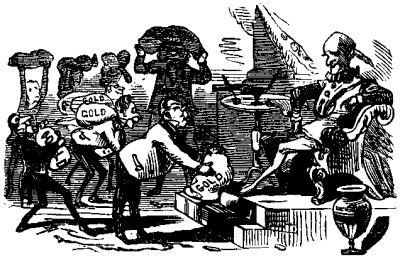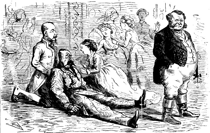 STOOP, SOMETIMES.   A SCENE FROM OLD NICK-OLOS NICK-OLBY. THE EMPEROR DE MANTALINI GOING TO THE "DEMNITION BOW-WOWS." OUR POLICE REPORT. On Tuesday last a suspicious looking man was arrested by the police, and taken to the One Hundred and Fourth Precinct Station House, on several charges of disorderly acts perpetrated by him in various parts of the city. He gave his name as CHARLES A. DANA, and was locked up for the night. Yesterday morning, prisoner was brought before Justice DOWNY, at the Jephson Market Police Court. Officer LOCUST, being called to testify, stated that his attention was directed to the prisoner, on Tuesday afternoon last, by some boys in Fourteenth Street. Prisoner was standing on the side-walk, on the side of the street opposite Tammany Hall. He was armed with a small pewter squirt, with which he was trying to smear the front of that building by drawing up dirty water from the gutter. The range of the squirt did not appear to reach more than half-way across the street. The water used was very foul, leaving stains upon a dirt-cart that was passing. While witness was watching the prisoner, the Hon. WM. M. TWEED came down the steps from Tammany Hall, and, upon seeing him, prisoner ran away, but was seized by witness, before he could make his escape. On being interrogated by the magistrate, prisoner said that he hardly knew what he was doing when arrested. The Sun was in his eyes at the time. If it hadn't been so, he would not have missed his shot. He must do something for a living, and he thought that throwing dirty water was as good an occupation as any other. Had made money out of it by threatening respectable people with his pewter squirt, and they would give him money rather than have their clothes soiled. He would do anything to make money; and he didn't in the least mind dirtying his hands in the making of it. To a question by the magistrate, as to whether he had had anything to do with casting offal into the bay, prisoner laughed in a wild manner, and said that he, for one, could never be accused of wasting good, honest dirt in that way. All the offal in the world, said prisoner, wasn't too much for him to use in bespattering the objects of his attention, friends as well as foes. He had heaved tons of offal, already, at Mr. A. OAKEY HALL, (whom he evidently imagined to be an Irishman, and called O'HALL,) He didn't care whom he hit, in fact, so long as he could make it pay. A gentleman connected with the velocipede interest, whose name our reporter did not catch, here stated that he became acquainted with prisoner nearly two years ago, while the velocipede frenzy was at its height. He had constructed to order for the prisoner a peculiar velocipede called the "Sun Squirt." It had a Dyer's tub attached to it, which was filled with bilge-water. On this machine, the prisoner, armed with a pewter squirt, used to practise for several hours a day, careering rapidly around the rink, and taking flying shots, as he went, at large posters attached to the wall, having portraits on them of General GRANT, Hon. H. GREELEY, Hon. WM. M. TWEED, The Mayor, Governor HOFFMAN, and several other citizens of admitted position and respectability. The bilge-water usually came back upon him, however, and he was generally a humiliating object on leaving the rink. Prisoner, on being asked by the magistrate whether he had any references respecting character to give, replied in the negative, whereupon orders were issued to lock him up, pending the appearance of Mr. PUNCHINELLO, who will have some statements to make about him at a future day. A reward of $5,000 has been offered for any information about the pewter squirt, and particularly as to when, and by whom it was made; and, as detectives are now engaged in working up the case, there can be but little doubt that the vile instrument will ere long be identified. DISTRESSING. Some awful smasher of cherished notions is trying to make out that ROUGET DE LISLE was not the real author of the famous Marseillaise, but that he stole it from the Germans. It pains us to contemplate the possibility of the charge being true, but, should it prove to be so, we suggest that the name of the accepted author be changed from ROUGET to ROGUEY DE LISLE.   "WHAT WILL HE DO WITH IT?" Servant. "MASSA FENTON AND MASSA CONKLIN HAVE SENT DIS YERE FOUNDLIN' TO YER, TO TOOK KEER OF FOR A FEW WEEKS." Matron Greeley. "O: DEAR, DEAR! AND IF IT SHOULD DIE ON MY HANDS, WHO'S TO PAY THE FUNERAL EXPENSES?" HIRAM GREEN AMONG THE FAT MEN. The "Last Gustive" attends the Annual Clam-Bake. Empires may totter and Dienastys pass in their checks. Politicians may steal the Goddess of Liberty poorer than JOB'S old Maskaline Gobbler. J. FISK, Jr., may set the heel of his bute down onto the neck of Rail Rodes—Steambotes—ballet gals, and all that sort o' thing, and this mundane speer will jog along, as slick as a pin, and no questions asked. But deprive a Fat man of his little clam-bake, and it would be full as pleasant as settin' down onto a Hornet's nest, when the Hornet family were all to home. That's so. Another cargo of clams has gone to that born whence no clam returns, onless you ram your finger down your throte, or take an Emetick. In the words of Commodore PERRY, who is, alas! no more. "The misfortenit bivalves meet the Fat man, and they're his'n." Altho' I'me not much on the fat order myself, I received an invitation to attend the grate Clam-bake. Mrs. GREEN put me up a lunch to eat on the cars, and robin' myself in a cleen biled shirt, I sholdered my umbreller and left Skeensboro. The seen at Union Park was sublime with plenty of Ham fat. If all flesh is grass, thought I, when old tempus fugit comes along with his mowin' masheen to cut this crop of fat men, I reckon he will have to hire some of his nabor's barns, to help hold all of his hay. Great mountins of hooman flesh were bobbin' about like kernals of corn on a red hot stove, remindin' me of a corn field full of punkins s