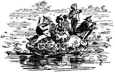 A War Conundrum. When are soldiers like writers for the press? When they charge by the column. A well-tilled Soil. The article on DICKENS, in the August number of the Atlantic Monthly, is certainly suggestive of fresh Fields, if not of pastures new. THE WATERING PLACES. Punchinello's Vacations. Sometimes Mr. PUNCHINELLO is very busy. Not only has he upon his shoulders the ordinary labors of conductor of a great journal, but he has much to do for other people. His editors, his printers, his binders, his artists, his engravers, his corps of clerks, his office and errand boys, and all connected with his extensive establishment, come to him from time to time for advice in regard to the investment of their surplus earnings, and between assisting in the purchase of a farm for this one, a house for the other, and all sorts of stocks and bonds for the rest, he is often terribly pressed for time.   No one who is not looked up to by a crowd of grateful dependents, all fattening in the shadow of his prosperity, as it were, can understand Mr. P's. feelings of responsibility at such times. Such an unusual demand upon his time occurred last week, and Mr. P. found that he would not be able to spend a few days as usual at some fashionable watering place. But be must have some recreation, so he determined to have a day's fishing among the celebrated Thousand Islands of the St. Lawrence. He put some luncheon in a basket, and set off quite early in the morning. Finding that some twenty hours were consumed in the transit, Mr. P. thought that, considering his hurry, he had better, perhaps, have gone to Newark for a day's fishing off the piers. But he was at the St. Lawrence now, and it would not do to complain. He hired a boat, lines, bait and two navigators, and set out bravely.   He sailed among a crowd of islands where either the bowsprit or the boom was continually getting caught in the shrubbery and rocks, until he came to island No. 18. Here was a picnic party. For reasons which the accompanying view may render obvious, Mr. P. and his men declined the invitation of the picnickers to stop and join them. The boat continued on until it reached the channel between islands No. 87 and No. 88, and there Mr. P. got out his lines and commenced to fish, trolling his bait behind as the boat slowly sailed, under the hot sun, among those lovely isles, where, to be sure, burning's half o' the sport, but where "burning SAPPHO" would have lost herself utterly, and probably have tumbled into some of the watery intricacies and have put herself out. Mr. P. did not have much luck at first. He caught one muskallonge, after a period of patient waiting which he feels he also must call long, and once, when he thought he was hauling in a fine bass, he turned very red when the boatmen laughed at seeing him "cotch an eel." But after a while he got a royal bite. He hauled in manfully, and although, owing to the intricacies of the channel, he could not see what he had caught, he knew it was a fine fellow from its weight. At last, after tremendous tugging, he got it in over the stem.   It was one of the thousand islands! What could be done now? The steersman, who had slipped under a seat when he saw the great mass above him, and the man who managed the sails, were both Canadians, and after a great deal of excited talk, they agreed if Mr. P. would make it worth their while, they would endeavor to put the island back in its place and make no remarks in public which would tend to produce a misunderstanding between the governments of Great Britain and the United States, on the ground of undue acquisition of territory. By the payment of a sum, which it will require a club of thirty subscribers to make good to him, Mr. P. concluded the arrangement, and they sailed back to replace the island. But what was the horror of the party, when they perceived on the unfortunate bit of British territory, a plate, which had stuck fast by reason of a covering of the juice of plum-pie, and a fork which was rammed firmly into the earth! It needed but few collateral evidences to convince Mr. P. and his men that this was the island where they had seen the picnic. And where were the picnickers? If any of Mr. P's. subscribers in Prince EDWARD Island, Costa Rica, the Gallipagoes, or other outstanding places, receive their paper rather late this week, they are informed that, in consequence of his having spent three entire days exploring the labyrinth of these islands in order to find the bodies of the unfortunate party of pleasure, (which bodies he did not find,) Mr. P. was very much delayed in his office business. His near patrons received their papers in due time, but those at a distance will excuse him, he feels sure, when they consider what his feelings must have been, while grappling for an entire picnic. The island was dumped down anywhere, without reference to its former place. When the Alabama claims are settled, Mr. P. will go back and adjust it properly. Mr. P. gained nothing by this trip but the knowledge that there are but 980 of these islands, which an unscrupulous monarchy imposes upon a credulous people as a full thousand, and the gloom which would naturally pervade a man, after an occurrence of the kind just narrated. On his way home, he stopped for supper at Albany, and there he met CYRUS W. FIELD and Commodore VANDERBILT. One of these gentlemen was looking very happy and the other very doleful.   (The tall gentleman in the picture is Mr. FIELD—not that he is really so very tall—but he is elevated. The short one is the Commodore—so drawn, not because he is short, but because he is depressed.) After the compliments of the season, (warm ones,) Mr. P. asked his friends how the war in Europe affected them. "Gloriously!" cried Mr. FIELD. "Nothing could be better. The messages fly over our cables like—like—like lightning. Why, sir, I wish they would keep up the war for ten years." "And you, sir?" said Mr. P. to the Commodore. "Oh, I hate 
