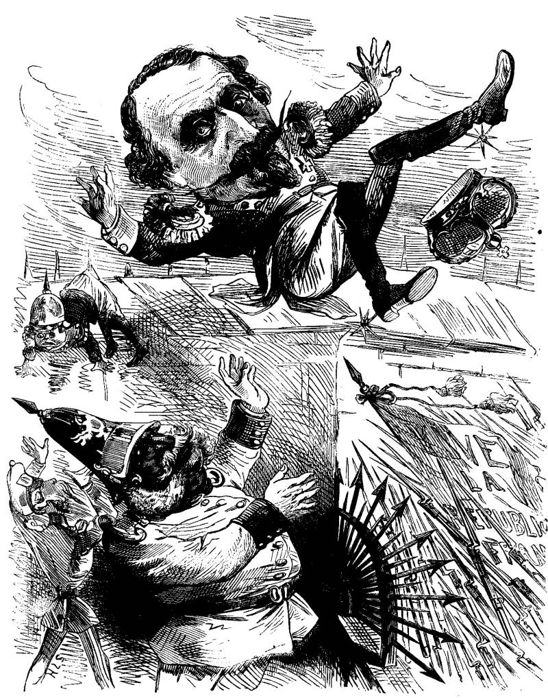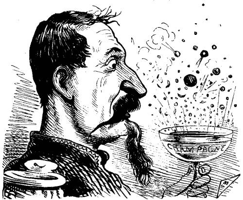 "IT WAS IN THE CHAMPAGNE COUNTRY THAT LOUIS NAPOLEON CAME TO GRIEF. THE FIZZ OF THE CHAMPAGNE WAS TOO MUCH FOR HIM, AND HE FIZZLED."—(Letter from a War Correspondent.) PUNCHINELLO AS A "SAVANT." MR. PUNCHINELLO: I have always taken a profound interest in Science. When a child my fond parents observed in me a decided taste for Entomology, the wings and legs of butterflies and grasshoppers being the objects of my special investigation. As a school-boy I obtained (despite the frequent closing of my visual organs) considerable Insight into Physical Science in the course of numerous pugilistic encounters. A close Application to Optics at that time enabled me to get some Light on the Subject. I was quite a phenomenon in Astronomy. While yet an unweaned infant I made numerous observations on the Milky Way, and when learning to walk frequently saw stars undiscernable with the most powerful telescope. Since my arrival at man's estate I have frequently experimented on the Elasticity of the Precious Metals, but have generally found it extremely difficult to make both ends meet. Considering, therefore, that I had as just a claim to be called scientific, as many who pretend to be Savants, I determined to attend the late Scientific Convention at Troy. My reception was most gratifying. On presenting my credentials to the Convention, that learned body welcomed me with open arms, and I was escorted to a place among the members by its distinguished head. Some of the speculations of these eminent philosophers were exceedingly profound, and it is really wonderful, Mr. PUNCHINELLO, to what an extent theory may be carried in the advance of science. Mr. GOOSEFELT read a learned and original paper—carefully compiled from various sources—on the Steam Engine, in the course of which he stated that his great aunt, who had been blown up on the first steamboat that ever went down in the Mississippi, during the great Earthquake of 1811, was still living. Also, that his godfather, the celebrated Mr. NICODEMUS, assisted (probably in the interests of science) in pulling down the statue of GEORGE III in the Bowling Green. The importance of these two facts cannot be over-estimated, as they will undoubtedly give a tremendous impulse to the wheels of science. Professor GREYWACKE, the eminent Geologist, delivered an address on Natural Petrifactions, indicating the various specimens of Ancient Fossils by which he was surrounded, and describing their formation. The audience was probably Petrified with astonishment at the immense learning and research he displayed, for it observed a Stony silence, only interrupted by an occasional snore. A brilliant paper on the Illuminating Power of Gas was read by Professor M.T. HEAD. It was a most Luminous production, and proved conclusively that an immense expenditure of gas sometimes throws very little Light on any Subject. The Professor is thoroughly versed in Meters, and is the author of the "Volume of Gas" which has attracted so much attention in the scientific world. Professor SUETT addressed the Scientists on the Effect of Tallow upon Ox(h)ides. From certain experiments made by him it appears that the Oleaginous principle is incompatible with Water, and unfavorable to the action of rust. A member was of the opinion that this important discovery might be turned to great practical advantage, as the application of cart grease to rusty iron axles might possibly facilitate the rotary motion of the wheels. This novel and valuable suggestion was hailed with shouts of applause, and the thanks of the Convention were immediately voted to the distinguished member, whose name I have unfortunately forgotten. Professor HYDRAGE read an Essay on the Transit of Mercury, which he said would take place in the form of a Bed Precipitate in 1878. It may possibly take place before then, however, as the Faculty of Medicine are said to be rapidly abandoning the use of calomel. The State Conchologist read an extremely interesting disquisition on the Oyster, which was divided into sections and literally devoured by the audience. He also exhibited some Specimens of Conchs, which were regular Sneezers in point of size. An announcement which was made by the distinguished Astronomer, Professor LOONEY, created a most profound sensation. He stated that with the aid of a powerful telescope he had discovered an immense Fissure in the Moon. He was quite positive that he had also observed a Man in the Gap. Although unable to distinguish the features of this individual, he thought it might possibly be JAMES STEPHENS, the missing Fenian Head Centre. When the excitement consequent upon this startling announcement had subsided, I rose and addressed the Convention as follows: "Ladies and Gentlemen: I cannot express, in words, the profound gratification with which I have listened to the learned and eloquent addresses which have just been delivered. The advancement of Science is an object which is worthy the efforts of such distinguished savants as I see around me, and to this object they have brought that profundity of learning which is only to be gathered from the perusal of elementary text books, that almost strabismal acuteness of perception which enables them to descry such great scientific truths as can be discovered through an orifice in a barn door, and that wonderful power of discrimination which enables them to distinguish between the seed of the leguminous plant known as the bean, and the other vegetable productions of Nature, when the bag is open. As an humble member of the Brotherhood of Science, I desire to contribute, in however insignificant a degree, to the Great Cause of Learning. I will therefore, with Your Permission, read" (loud cries of 'No! No!' 'Put him out!' etc., to which of course I paid no attention,) "the following papers: 'An Inquiry as to Whether Diptheria has anything to do with the Migration of the Swallow,' 'On the possibility of straightening the curve of the African Shin Bone.' 'On Marin
