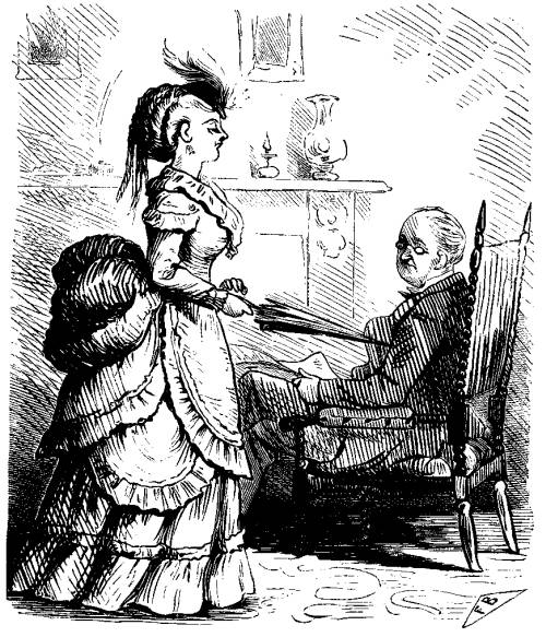 FASHIONABLE RELIGION. Father. "WELL, MY DEAR, DID YOU HAVE AN AMUSING SERMON THIS MORNING?" Daughter. "O NO!—VERY STUPID. DR. CHIPPER ISN'T THE LEAST FUNNY NOWADAYS—PREACHES THE REGULAR OLD MISERABLE SINNER SORT OF BUSINESS." GREAT MEN OF AMERICA. By MOSE SKINNER DANIEL WEBSTER Was the sort of a man you don't find laying round loose nowadays to any great extent. It's a pity his brains wasn't preserved in a glass case, where the imbecile lunatics at Washington could take a whiff occasionally. It would do 'em good. We are told that as a boy DANIEL was stupid, but this has been said of so many great men that it's getting stale. Some talented men were undoubtedly stupid boys, but it doesn't follow that every idiotic youth will make an eminent statesman. But there are plenty of vacancies in the statesman business. A great many men go into it, but they fail for want of capital. If they would only stick to their legitimate business of clam-digging, or something of that sort, we should appreciate them, and their obituary notice would be a thing to love, because 'twould be short. But D. WEBSTER wasn't one of this sort. He didn't force Nature. He forgot enough every day to set five modern politicians up for life. When he opened his mouth to speak, it didn't act upon the audience like chloroform, nor did the senate-chamber look five minutes after like a receiving tomb, with the bodies laying round promiscuously. I should say not. He could wade right into the middle of a dictionary and drag out some ideas that were wholesome. Yes, when DANIEL in that senatorial den did get his back up, the political lions just stood back and growled. Take him altogether he was our biggest gun, and it's a pity he went off as he did, for he was the Great Expounder of the Constitution. HON. JOHN MORRISSEY Is also a Great Ex-pounder. Even greater than WEBSTER, for the constitution of the United States is a trifling affair, compared with the constitution of J.C. HEENAN. Mr. MORRISSEY is a very able man and made his mark early in life. Before he could write his name, I'm told. No man has made more brilliant hits, and his speeches are concise and full of originality. "I'll take mine straight." "No sugar for me," &c., have become as household words. A man like this, though he may be vilified and slandered for awhile, will eventually come in on the home stretch with a right bower to spare. That's a nice place JOHN has got at Saratoga. Fitted up so elegantly, and with so much money in it, it looks like a Fairy bank with the fairies gambolling upon the green. It's all very pretty, no doubt, but excuse me if I pass. GEORGE FRANCIS TRAIN. This gentleman is yet destined to send a thrill of joy to our hearts, and flood our souls with a calm and tranquil joy. This will come off when his funeral takes place. He wasn't born like other people. He was made to order for the position of common scold in a country sewing-circle. But he wasn't satisfied. He wanted to be an Eminent Lunatic and found private mad-houses. And so he began to lecture. He used to rehearse in a graveyard, and it was a common thing for a newly-buried corpse to organize a private resurrection and make for the woods, howling dismally. A village out West was singularly unfortunate last summer. In the first place the cholera raged, then they had an earthquake, and then G.F. TRAIN lectured three nights. Owing to this accumulation of horrors the village is no longer to be found on the maps. TRAIN'S second night did the business for 'em. The once happy villagers are now aimless wanderers, and one poor old man was found in the churchyard, studying a war map of Paris and vicinity in a late New York paper. It is said that TRAIN has his eye on the White House, and is indeed a shrewd, far-seeing man. When he visited Europe and kissed all the little Irish girls, could he have had in his mind the time when they, as naturalized American Female Suffragers, would cast their votes for G.F. TRAIN as President? That the mind of the reader may not become hopelessly dazed by contemplating this last paragraph, I will stop. MOTHER GOOSE. I cannot close these memoirs without a simple tribute to this remarkable woman, who has probably done more to mould the destinies of this Republic than any other man put together. She was an eminently pious woman, devoted body and soul to Foreign Missions, and to the great work of sending the gospel to New Jersey. But it was as a composer that her brilliant talents stand preeminent. MOZART, BEETHOVEN, and a host of others excelled in this respect, but they all lack that exquisite pathos and graceful rhetoric which so distinguished this queen of literature. The beautiful creations of that fruitful brain are as a passing panorama of constant delight. Her style is singularly free from affectation, and, while we are at one moment rapt in wonder at her chaste and vigorous description of the annoyances of a female in the autumn of life, training up a large family in the limited accommodations afforded by a common shoe, we cannot but feel a twinge of compassion for the singular Mrs. HUBBARD and her lovely dog, who "had none," only to have those tears chased away by the arch and guileless portrayal of the eccentric JOHN HORNER. That we cannot to-day gaze upon the classic lineaments of her who welded such a facile pen, is a source of the most poignant regret. It is a crying shame, for I think I am correct when I say that there does not exist on the civilized globe a statue of this peerless woman, but she will always live as long as there are infant minds to form, or tender recollections of childhood to remember. P.S.—I forgot to say that I hold a copyright of old GRANNY GOOSE'S works. I have just got it renewed, and it is as vigorous as a kicking-mule. Send in your orders. Contributions to the old gal's statue will be duly acknowledged, and deposited with my tailor. THE PLAYS AND SHOWS.