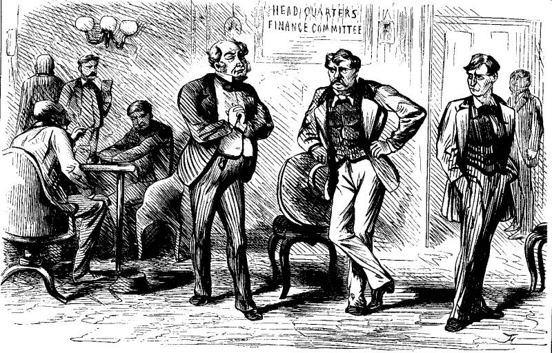 A MODEST REQUEST. Disbursing Agent of Political Organization [to Delegation on biz.]: "AH! GENTLEMEN, YOU REPRESENT THE----" Spokesman. "YES; WE WANT $200. I'M THE KNOCK-'EM-DOWN CLUB, AND HE'S THE TARGET COMPANY." THE WRONG "DUMMIE." Gatling (our countryman, you know) has invented a Battery Gun. They have been trying this gun over at Shoeburyness (how is that, for a name?) in England, to see whether they had not better order a few, in time for the next war. It seems that they conducted their experiments by firing at "dummies, representing men." (Oh, if they had only had some of our American Dummies there, who Represent Men so inadequately.) There were 136 of these simulacra, "99 of whom," says the report "would have been killed." That is, if it had been possible to kill them. In fact, they would have been killed four or five times over. "Kilt intirely." We shall always feel that a great opportunity was here lost of ridding the country of certain nuisances, who, if anything at all, are worse than dummies, and deserve not four only, but four hundred balls in them, "forty-two one-hundredths of an inch in diameter," or even larger. There are so many, it would be useless to attempt to specify them: and besides, everybody knows who they are. We would begin with the Politicians, and end with the Brokers. And then the Millennium would begin, "sure pop." TROUBLE FOR THE RISING GENERATION. Mr. PUNCHINELLO has often thought with what melancholy feelings the naughty boys must gaze upon a fine grove of growing birches; but what pangs would a knowing child experience upon finding himself in Randolph county, Illinois, where they raise twelve bushels of castor-oil beans to the acre! Of what depths of juvenile wretchedness and precocious misanthropy is that crop suggestive! We see it all—the anxious parent—the solemn doctor—the writhing patient—the glass—the spoon! Howls like those of a battle-field, only less so, fill the air. The wretched victim of pharmacy, conquered at last, gives one desperate gulp to save himself from strangulation, and all is over! Ye who remember your boyhood's home! tell us if there was any joke in all this! THE GREAT MODERN O MISSION.—The English Mission. THE LITERARY