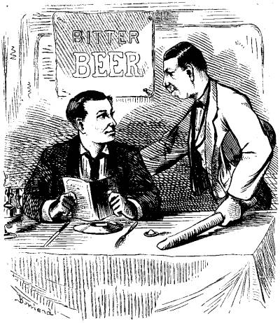 Who thought the world his debtor and himself, of course, its creditor; A man he was of wonderful vitup'rative fertility, Though seeming an embodiment of mildness and docility, This ancient agriculturist, philosopher, and editor. The clothes he wore were shocking to the citizen æsthetical, Assuredly they would not pass in circles which were critical, So venerable were they, and so distant from propriety, So utterly unsuited to respectable society, Which numbers in its membership some citizens æsthetical. He kept a model farm for every sort of wild experiment. Which was to all the neighborhood a source of constant worriment; For every one who passed that way pretended to be eager to Discover pumpkin vines that ran across the fields a league or two, So queer was the effect of each preposterous experiment. He had a dreadful passion, which was not at all professional, For going for an office, either local or congressional. But though often nominated, yet the people wouldn't ratify, Because they thought, quite properly, it would be wrong to gratify The all-consuming passion that was not at all professional. Among the many hobbies which he cantered on incessantly Was one he called Protection, and he rode it quite unpleasantly; For if any one dissented from his notions injudiciously, He went for him immediately, ferociously and viciously, Did this absurd equestrian who cantered on incessantly. With which remarks the author of this brief, veracious history Concludes his observations on the incarnated mystery Known as an agriculturist, philosopher, and editor, Who thought the world his debtor, and himself, of course, its creditor, And who will surely figure on the oddest page in history. THE FITTEST PLACE FOR A "PRESERVER" OF THE PEACE. A "Jam" on Broadway. DR. HELMBOLD TO J.G. BENNETT, Jr. "Boo-shoo! fly." ![]() A BRIGHT IDEA. Customer. "WAITER, BRING ME SOME FROZEN CLAMS." Waiter (lately caught). "YES, SIR; WILL YOU HAVE 'EM ROASTED OR BILED?" WORDS AND THEIR USES. Nothing, except counting your stamps, can be more pleasant and exciting than tracing out the origin of words by the aid of a second-hand dictionary. It's the next funniest thing to grubbing after stumps in a ten-acre lot. Dentists make capital philologists—: they are so much accustomed to digging for roots. It's rather dull work to shovel around in the Anglo-Saxon stratum, but, as soon as you strike the Sanscrit, then you're off, and if you don't find big nuggets, it's because—well, it's because there are none there. Sometimes you dig down to about the time when NOAH went on his little sailing excursion, and strike what seems to be a first-class sockdolager of root, but what is the use? Unfortunately the philology business is overdone; it's chock full of first-class broken down pedagogues and unsuccessful ink-slingers, and, as soon as you offer a curious specimen in the way of roots, they write a book to prove that the root don't exist, or, if it does, that it should not. However, there is an advantage in knowing the roots of words, and the use to which they were put in former years. Everybody, you know, is very anxious to read CHAUCER and SPENSER. Now, after you have studied this subject about forty-two years, you will be able to read CHAUCER with the aid of an old English dictionary and an Anglo-Saxon grammar. Many so-called philologists, who have preceded me, have ignorantly derived words from improper sources. Thus, the compound word, shoofly, has been traced by some to the Irish word shoe, meaning a hoof-covering, and the French word fly, meaning an insect, when it is apparent to even the casual observer that it comes from the Guinea word shoo, meaning get out, and the English word fly, meaning a tripe destroyer. I propose, therefore, to show you the origin of a few words, in order that you may use them properly, and in order that you may subscribe freely for my book on this subject, which will shortly be placed before an admiring public. Theatres. When the players were servants of the king, they were compelled to be proficient in reading, riting, rithmetic, rhyming, riddling, reciting, rehearsing, and romping. These accomplishments were grouped together and called the 8 r's, which name naturally enough was soon applied to the play-houses. This example shows how simple the whole subject is, and how easily the philology business could he run by a child six years of age. Country. The origin of this word is, to say the least, odd. City people were accustomed to visit the rural districts at about the time when rye was ripe, and they were generally amused by the farmer's pereginations around his rye. Farmers always count rye-stacks in the morning, in order to discover whether any of them have been lifted during the night. When, upon their return to the City, the visitors were asked where they had been, they facetiously replied, "To count rye." This soon became a favorite expression; the "e" was dropped for euphony, and the rural districts were called country. Spittoon.—This word comes from the Greek word spit, meaning to slobber, and the Scotch word, tune, meaning the noise made by the bag-pipes. As the saliva struck the receptacle it made a noise delightful to the ears of the smoker, and resembling the note of the national instrument of Scotland. Hence the receptacle was called the spittoon. Politics.—Quack philologists, who evidently were insane, have gone back to the classics for the root of this word, when it is well known that immediately after the termination of the Revolution, when the Government of this country was about to be settled, the word came into existence. A woman, called POLLY, kept a corner grocery in New York, and all the fellows who wanted offices were accustomed to go to POLLY'S for their beer, because she trusted. Here they usually divulged their ideas of the manner in which the Government machine should be run. When asked why they went to that store, they always answered, "POLLY ticks." Outsiders, whe