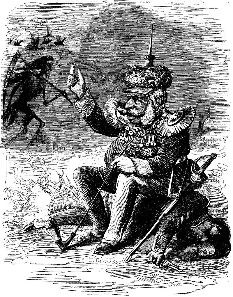 KING WILLIAM OF PRUSSIA WAITING FOR HIS ALLY. HIRAM GREEN ON MARK TWAIN'S BABY. The "Lait Gustice" congratulates the newly organized Papa. SKEENSBORO, NYE ONTO VARMONT. Friend TWAIN—Allow an old statesman, which has served his country for 4 yeers as Gustise of the Peece, rite a congratulotery letter to you on your success as a boy raisest. Altho your name is MARK TWAIN, I notiss that on this occashon you dident Mark but One. I am a little older in years and Parentelism than you are, and am able to call myself the seenyer pardner in a firm who are the sole proprieters of eleven offspring and 2 grand-children. Raisin children is a bizziniss which haint every mans best holt, and as long as you've got into the bizziness, excoose me for givin you a little wisdom, which you as a parent must swaller without makin up a face. If your child, in its infantile days, is given to squallin nites, obtain a beverige, called soothin sirup, and just before you pull off your butes nites, give the little cuss about 3 tablespoons full, and he will sleep so sound that you can use him for a piller. Should he kick & squall, and refuse to take it, lay him down onto the floor, set on him, then takin hold of his nose, pour the stuff down his throte, and you've got him, ekal to Jo JEFFERSON'S Rip Van Winkle 20 yeers snooze. To amoose him—If your wife is too bizzy durin the day, doin the cookin, washin, &c. 4th, to amoose the child, give him an ink bottle, and set him down on the parler carpet. If he has any idee of geografy, when you come home nites you will find a good helthy map of the black sea, which Rooshy will insist on bein added to your war map. Another way of amusin him, is to give him a raiser, and let him play learn to shave. If he should cut his nose off, it would make the little shaver smart. If you expect to bring your boy up to hold offis,' let him cultivate cheek. This is done by tyin his grandmother in her rockin cheer, and lettin him pelt the old lady with snow balls in the winter time. In the summer time get him a bow and arrer, and let him see how neer he come to the venerable lady's nose without breakin her spectorcals. If this don't make him cheeky enuff to hold offis, let him pour a lot of benzine onto his little cuzzin, then push her onto a red hot cole stove. If he can do this and think it a joak, he will do for a cabinet offiser. If he tries to jump over parental authority, fill him with shot, same as your man did his jumpin frog, only pour it into him with a mustick. If you've got any regard for our nashnal caracter, don't let your son rite comic copy for the noosepapers, after which, be so rash as to rite a book, and have English crickets set up their darn singin, when they catch your little innocent abroad. JOHN BULL don't tickle easy, remember that. I actually believe you couldent stir him with a hul bag full of laffin gas. As your boy has entered the Lecture field, I shouldent be surprised if he got up quite a breeze on the roast-rum. In fact, when he opens his mouth before an audience, look out for squalls. When your offspring is big enuff to enjoy chastisin, remember the "good little boy," and examine your son's garments to see if the lad has been roostin onto any nitro-gleserine cans, lest the parental hand, when brought in contact with the youth's habeas corpus, mite necessitate the sweepin up of father and son's scattered remnants. Let your son reed the works on good morril men's lives. By the time he gets old enuff to read, I will have my life out in pamphlet form, and you can draw onto me for a copy. Beware of works of fiction. Don't let your boy have a great deal to do with such readin as HOYLE on Games, TOM PAINE on Infidelity, nor HORRIS GREELY on farmin. Such works are bringin more ruin onto the country, than the numerous jewrys of twelve talented men, who allow murderers to come the loonatic dodge over 'em. I don't believe in spoilin the rod and sparin the child, but I think it is well enuff to keep a rod hung up in the barn, where your child can occasionally look at it, to see what he will come to, if he undertakes to kick over the traces. Children are a good deal like wimmen. If you don't set your foot down when you first get married your wimmen will raise their foot up, and afore you realize any pain, your gentle form will be histed out into the street. With boys you must begin talkin turkey, when they are young goblins, ef you don't, when they get old enuff, they will "strike for their sires," and gobble up the old man's scalp. Teach your son to honor his pa and ma, and decline the English mission, when it comes his turn. Between you and I, aspirants for the honor of bordin with St. JIMMY are on the decline, Pitty it haint a gin-cocktail. I shouldent be surprised, if some big criminal was sentenced to go there yet, which minds me of a konundrum. Why is the English mission like lager beer? Give 'er up? Because it ruins any minister's reputation, who goes for it. Hopin that when you shovel off your mortil coil, that your mantle may not pass out of the family, and as time flies on with greased wings, you may make the family name sound by bein able to Mark Twain in your family record, I drop the goose feather. Ewers, parentally, HIRAM GREEN, ESQ., Lait Gustise of the Peece. A SURE WAY OF DOING IT. Seekers after notoriety must often be at their wits' end for some new sensation with which to advertise themselves. Mr. TWAIN, for instance, having gone through Fenianism and France, seems to have collapsed for the present; and here now comes Mr. WEMYSS JOBSON, who subsided into oblivion years ago, but has just emerged again into the light of The Sun. The efforts of both these gentlemen to keep themselves prominently before the public, however, are very inadequate and feeble. They should suffer more and be stronger. Let TRAIN do a bold stroke of business by declaring himself the perpetrator of the latest mysterious murder, and it might be the making of the exhumed JOBSON to re