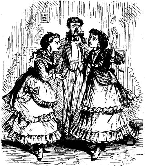 I say to her, "An old comedy is to the comedy of to-day, precisely what an old beau, padded, painted, simpering with false teeth, and leering with rhumy eyes, is to a handsome, gallant young fellow, such as Mr. LESTER WALLACK impersonates in Ours or School." To which she replies, "What are roomy eyes, dear?" (Being her fourth cousin by marriage, I am a sort of maiden aunt to her,—whence this respectful familiarity.) "Eyes in which there is room for the honest glances that never show themselves?'" I sternly remark that "nice girls never pun." "Yes," she replies; "punning, like beer and other vices, is the peculiar prerogative of men, I suppose. But you need not be afraid. I read PUNCHINELLO sometimes, and it is a terrible warning to people who are tempted to pun. I could give you frightful instances of the appalling depth to which the men who make puns in PUNCHINELLO occasionally sink." I hastily close the discussion by inviting her to come to WALLACK'S and see an old comedy. So we find ourselves on the following evening in the only theatre in the country where that rather important adjunct of a theatre—a company—is to be found, There are quantities of elegant dresses in the house,—the ladies having an idea that an old comedy is one of those things which every fashionable person ought to see. There are also numbers of nice young men, who, being the burning and shining lights of fashionable society (after their day's work behind the counter is ended), come to be bored by the old comedy, with a heroism which proves how immeasurably superior to the influences of tape and calico are their youthful souls. By the by, it is one of the unavoidable désagréments of New York society that the wearer of the elegant dress is often conscious that her partner in the waltz knows precisely how many yards of material compose her skirt, and exactly how much it cost per yard, for the excellent reason that he himself measured it with his professional yard-stick, and cut it with his private scissors. This, however, is a subject that belongs not to old comedy, but to the extremely modern comedy of New York society. The two resemble each other only so far as they are fashionable and dull. But to our WALLACKIAN old comedy. The curtain rises upon the veteran GILBERT and the handsome ROCKWELL. They converse in the following style: GILBERT.—"Well, you young dog, ha! ha! So you have decided to make your old uncle happy by marrying my neighbor's daughter. Gad! I remember my own wedding-day. Well, well; we won't talk about that now, but hark ye, you young villain, if you don't marry the girl, I cut you off with a shilling." ROCKWELL.—"My dear uncle, I can have no greater pleasure than to fulfil your wishes. But suppose our adorable young neighbor has the ill-breeding to refuse me." GILBERT.—"Refuse you! Refuse my nephew? Gad! I'd like to see THOMAS OLDBOY permit his daughter to refuse my nephew! I'd—d—e, I'd—" (chokes and stamps with rage.) Further on we meet with Miss OLDBOY and her mother,—the latter a stout old lady, addicted to smelling salts and yellow silks. LYDIA OLDBOY.—"To-day I am expecting the arrival of young WILDOATS, who comes to pay his addresses to me. I wonder if he is like that dear, delightful THADDEUS OF WARSAW." Mrs. OLDBOY.—"Now, Miss, remember that your honored father insists upon this match. I expect you to be a dutiful daughter, and accede to his wishes. Here comes the young man himself." ROCKWELL.—"My. dear Mrs. OLDBOY, I am charmed to see you. You are looking positively younger than your ravishingly beautiful daughter. Fair LYDIA, I come to lay my heart at your feet. 'Tis the wish of my uncle and your honored father that we should unite our respective houses. Let me touch that exquisite hand. Unseal those ruby lips and tell me that I am the happiest of men." Here the UNCLE and OLDBOY enter. They chuckle, and poke one another in the ribs, remarking "Gad" and "Zounds" at intervals. They bless the young couple, and order up some of the old Madeira. The curtain falls as OLDBOY gives the health of the young people, with the wish that they may have a dozen children, and a cellar never without plenty of this splendid old Madeira,—"that your father, bottled, Miss LYDIA, the year our gracious sovereign came to the throne." This is a fair sample of the old comedy. The oaths are of course omitted, out of deference to the tender susceptibilities of the editor of PUNCHINELLO. So are the indecencies, which are the spice of the old comedy, but which cannot be written in a respectable journal, and are almost too gross and brutal for the Sun. Take from an old comedy its oaths and its grossness, and nothing is left but a residuum of boisterous inanity. The condensed old comedy which has just been laid before the readers of PUNCHINELLO, is as inane and vapid as anything that WALLACK'S theatre has shown us in the past month. Do you find it dull? For my part, I don't hesitate to say that the "Essence of Old Virginny," as furnished by the venerable poet, Mr. DANIEL BRYANT, is vastly more amusing than the Essence of Old Comedy. All of which I say, in my most impressive manner, to MARGARET as we struggle through the crowded lobby. But she irreverently disputes my assertions, and asks, "How is it that everybody admires these comedies if they are so wretched as you say they are? Is your judgment better than that of anybody else?" There being nothing to say, if I mean to maintain my ground, except that my judgment is the only infallible critical judgment in this city or elsewhere, I promptly and unblushingly say so. But MARGARET tells me I am "a goose"—(I think I have mentioned that she is my aunt, and hence allows herself these pleasing freedoms of speech)—and says that I shall take her to see the old comedies every night, until I am willing to say that I like them. Who is there that, in view of this threat, will not drop the tear of sensibility, so neatly alluded to by Mr. STERNE, i